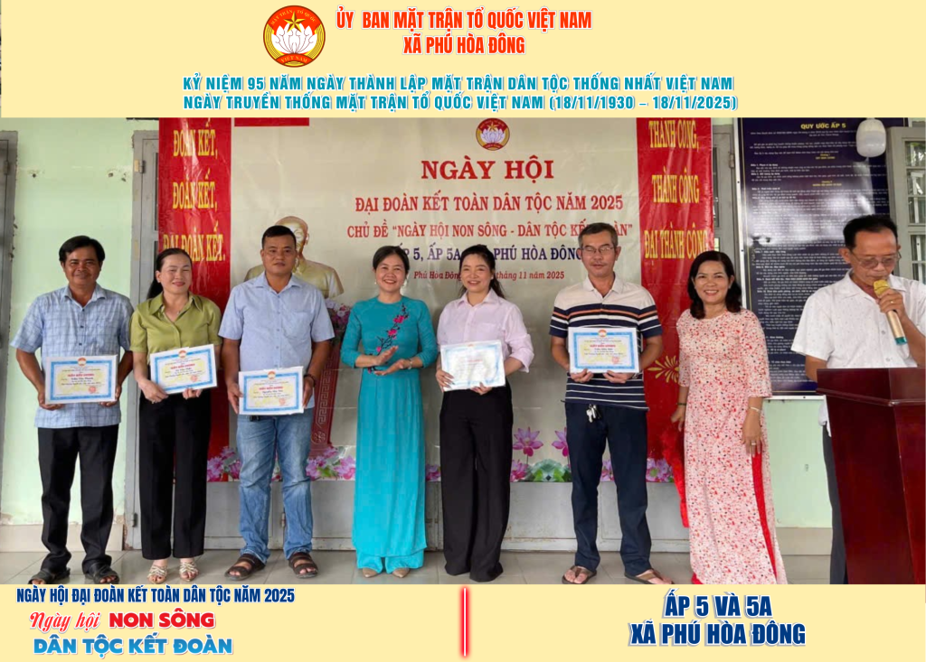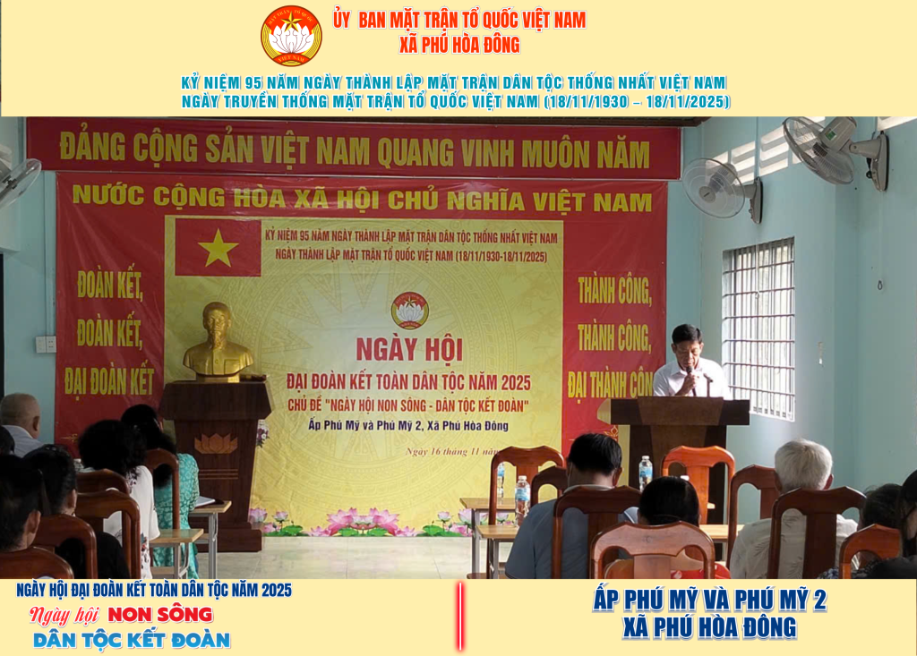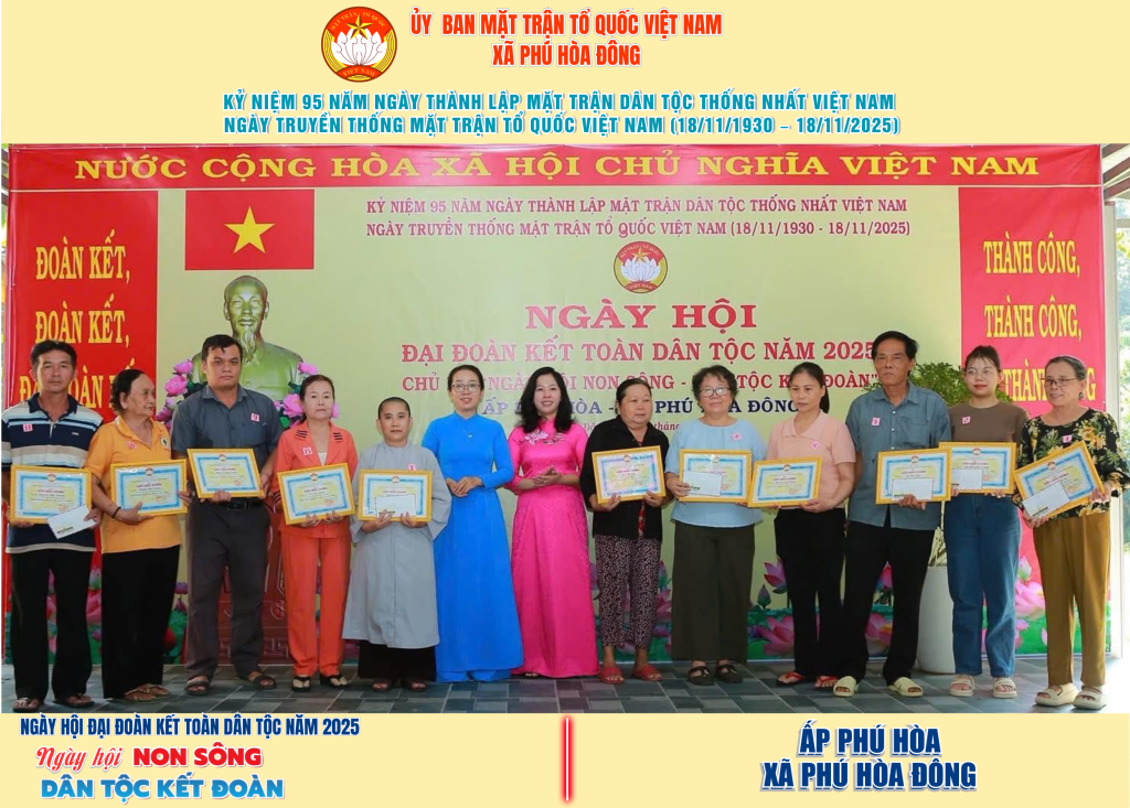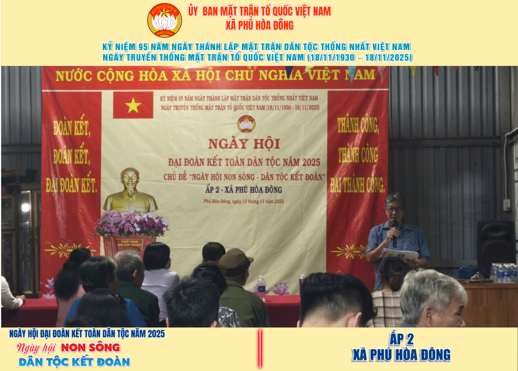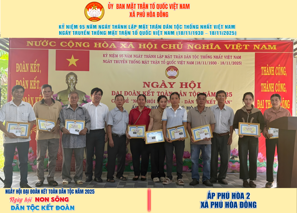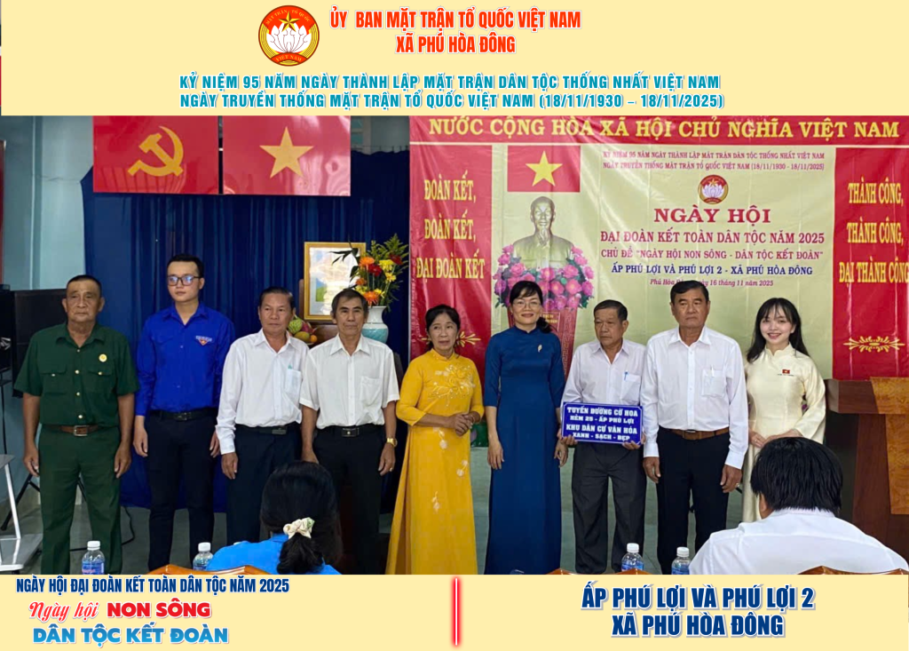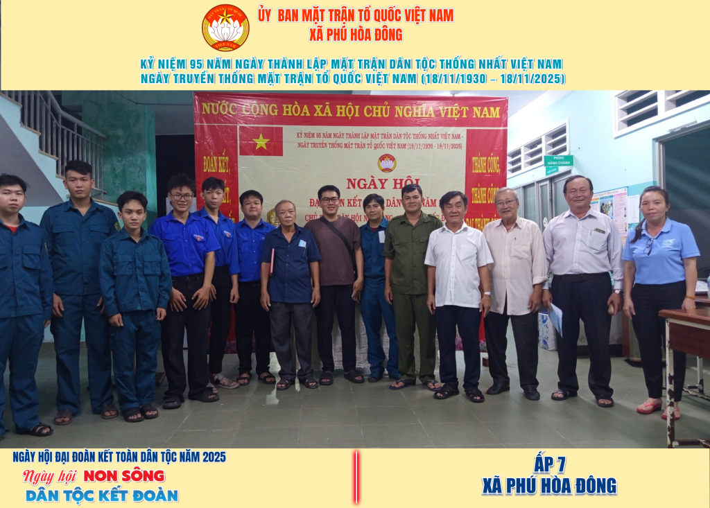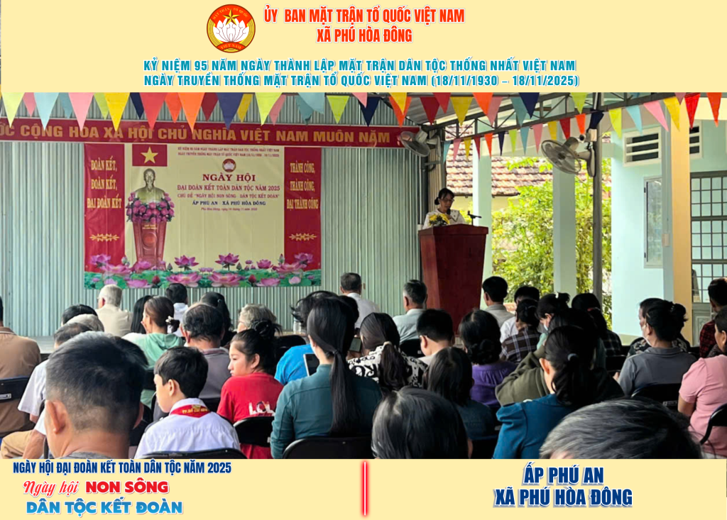 Từ ngày 08/11 đến 18/11/2025, 57/57 ấp trên địa bàn xã Phú Hòa Đông đã tổ chức thành công Ngày hội Đại đoàn kết toàn dân tộc năm 2025, thu hút đông đảo Nhân dân tham dự, tạo không khí vui tươi, đầm ấm và đoàn kết.