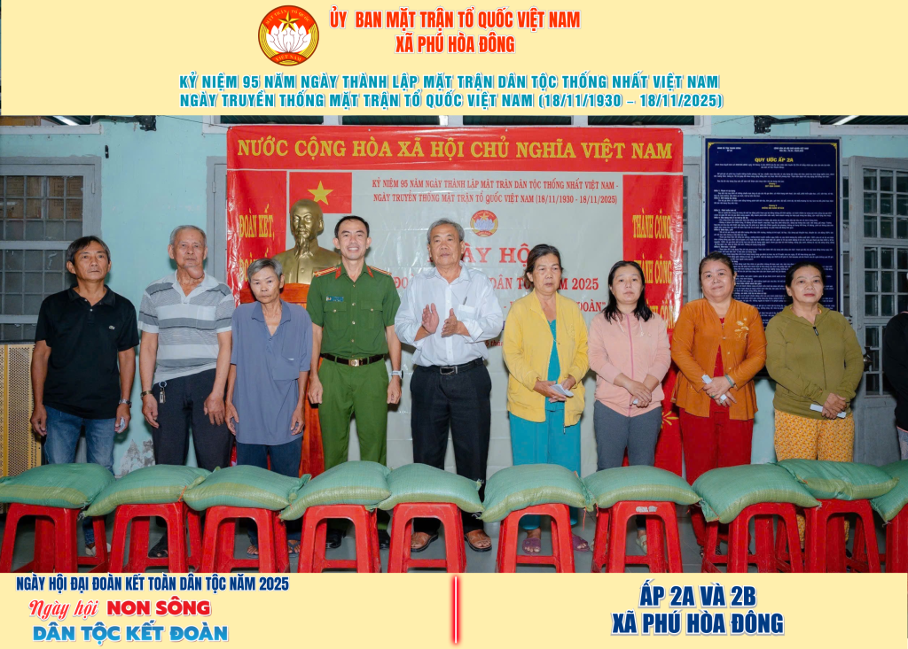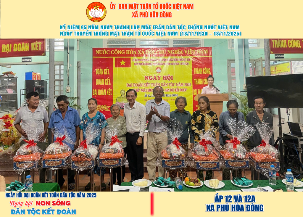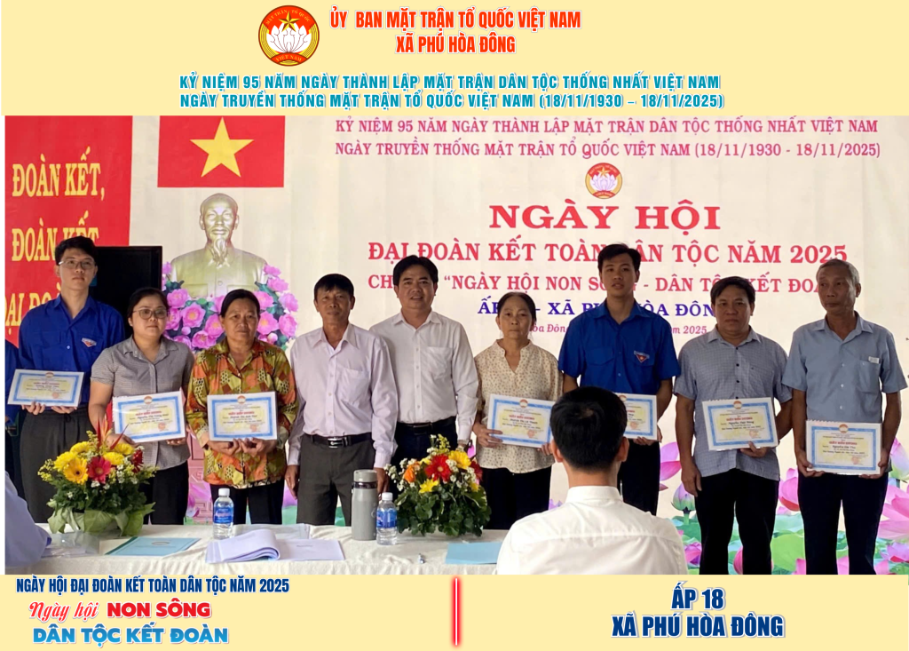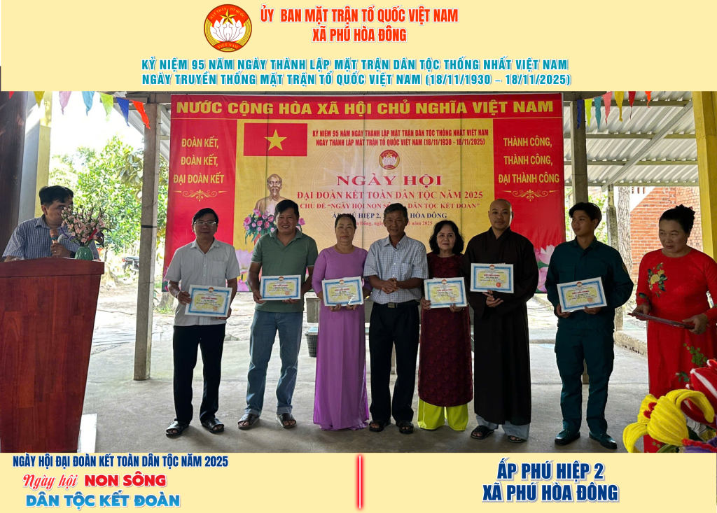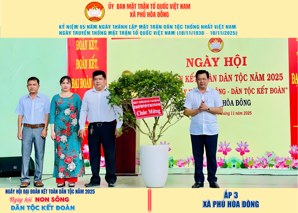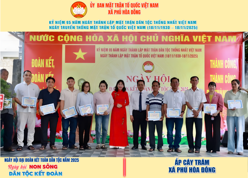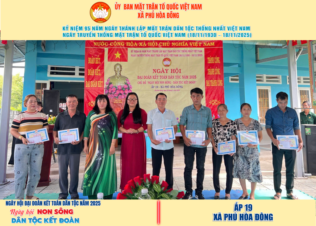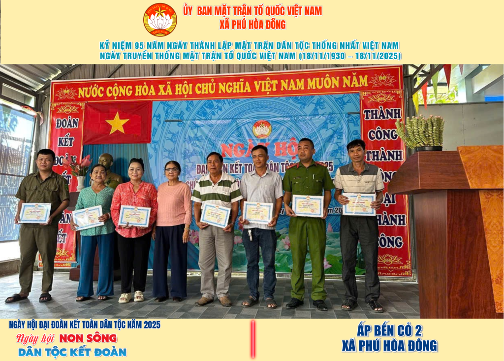 Từ ngày 08/11 đến 18/11/2025, 57/57 ấp trên địa bàn xã Phú Hòa Đông đã tổ chức thành công Ngày hội Đại đoàn kết toàn dân tộc năm 2025, thu hút đông đảo Nhân dân tham dự, tạo không khí vui tươi, đầm ấm và đoàn kết.