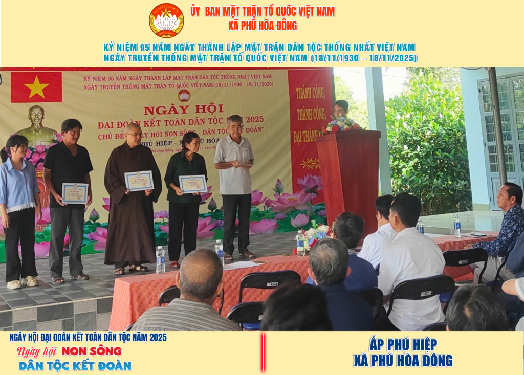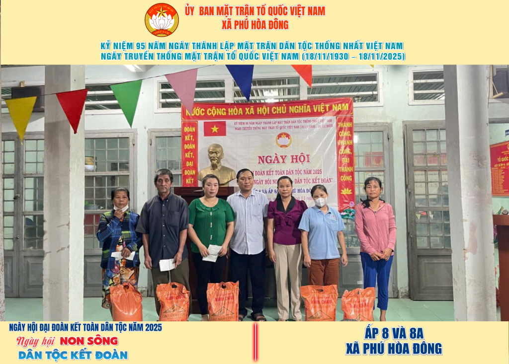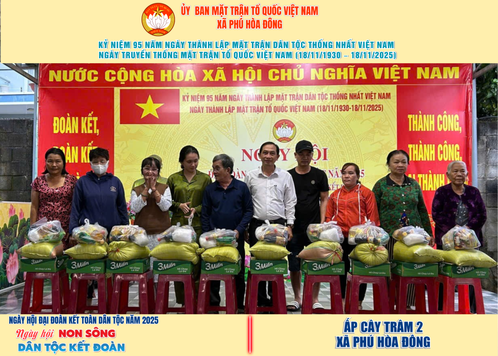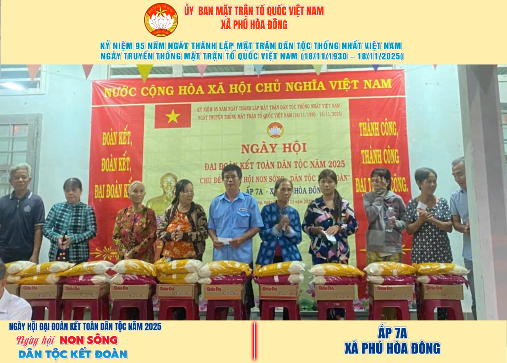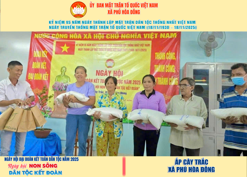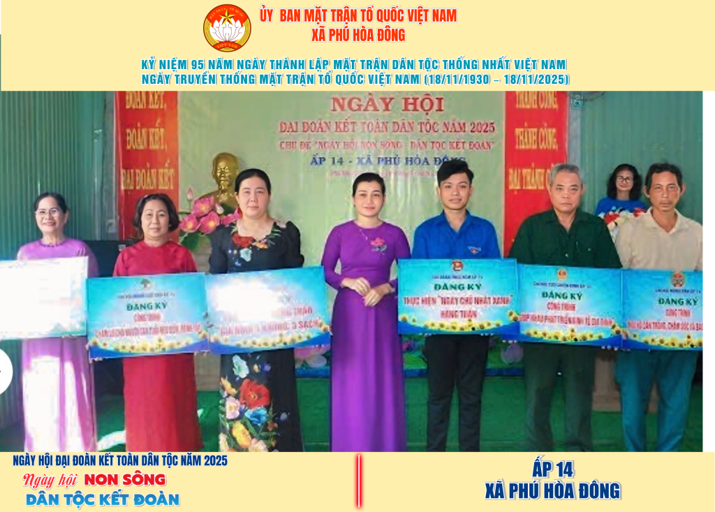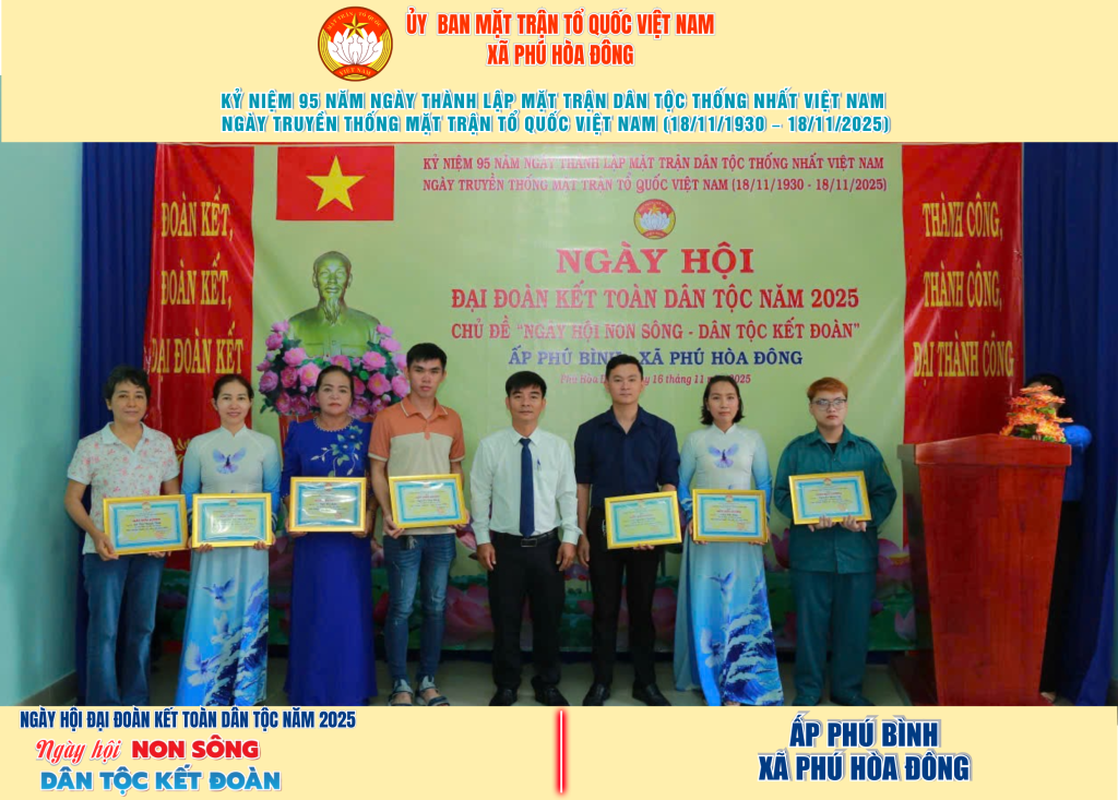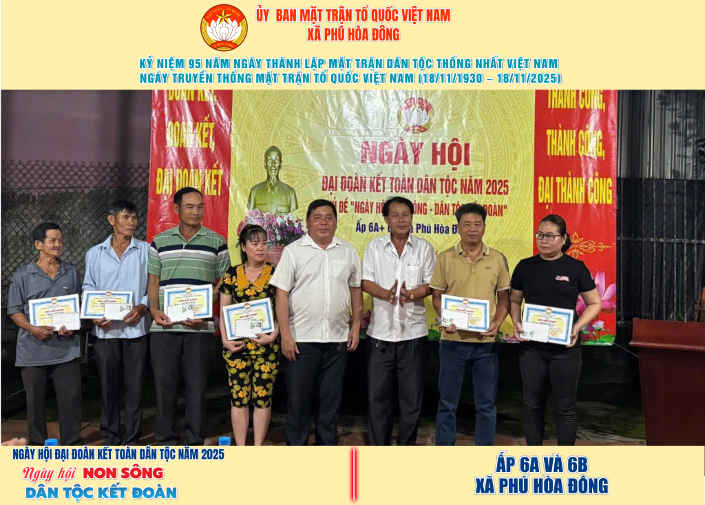 Từ ngày 08/11 đến 18/11/2025, 57/57 ấp trên địa bàn xã Phú Hòa Đông đã tổ chức thành công Ngày hội Đại đoàn kết toàn dân tộc năm 2025, thu hút đông đảo Nhân dân tham dự, tạo không khí vui tươi, đầm ấm và đoàn kết.