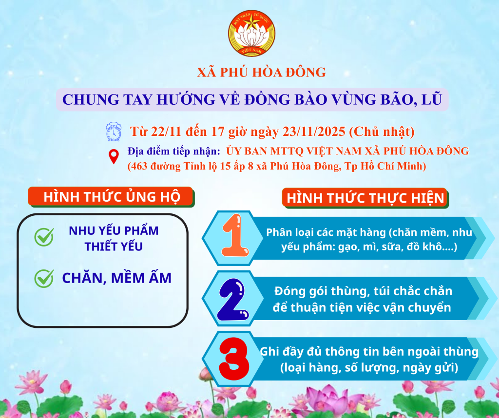 Ủy ban MTTQ Việt Nam xã Phú Hòa Đông rất mong nhận được sự chung tay của quý cô, bác , anh chị, đoàn viên, hội viên hỗ trợ nhu yếu phẩm, quần áo cho đồng bào đang gặp khó khăn do bão, lũ.