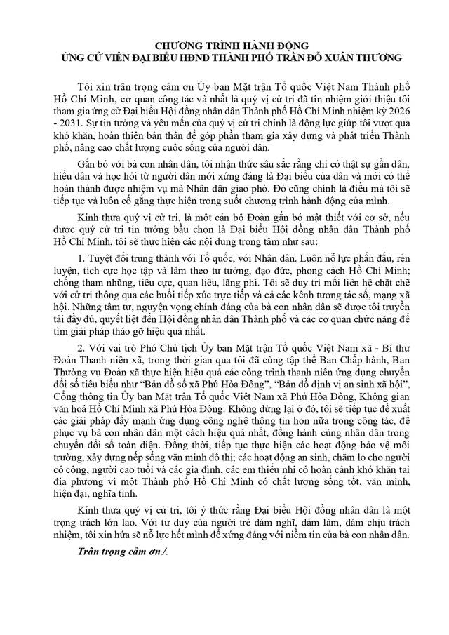 Chương trình hành động của bà Trần Đỗ Xuân Thương, Ủy viên Ban Chấp hành Đảng bộ, Phó Chủ tịch Ủy ban Mặt trận Tổ quốc Việt Nam xã, Bí thư Đoàn thanh niên xã ứng cử Đại biểu Hội đồng nhân dân Thành phố Hồ Chí Minh khóa XI, nhiệm kỳ 2026 – 2031.