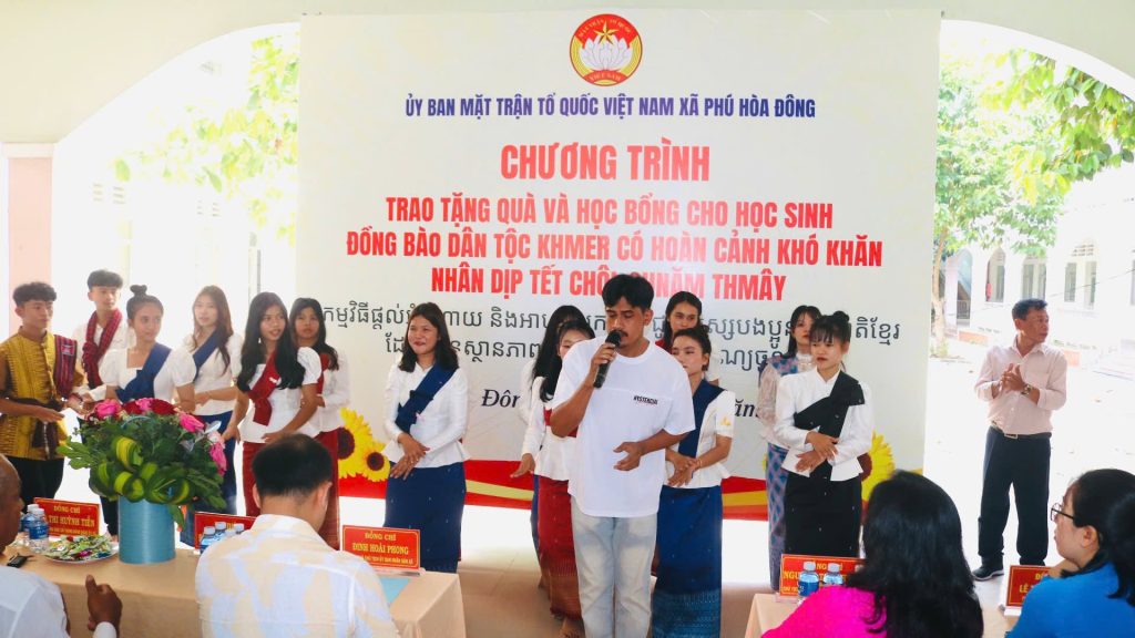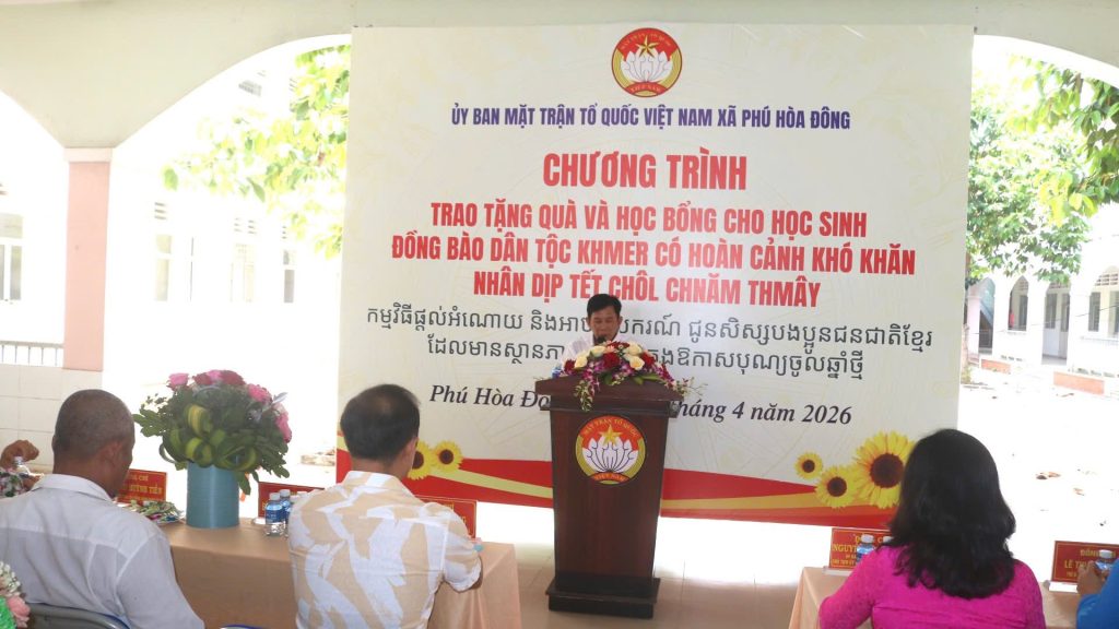 Sáng ngày 12/4/2026, Ủy ban MTTQ Việt Nam xã Phú Hòa Đông đã long trọng tổ chức chương trình trao tặng quà và học bổng cho học sinh đồng bào dân tộc Khmer có hoàn cảnh khó khăn nhân dịp Tết cổ truyền Chôl Chnăm Thmây.