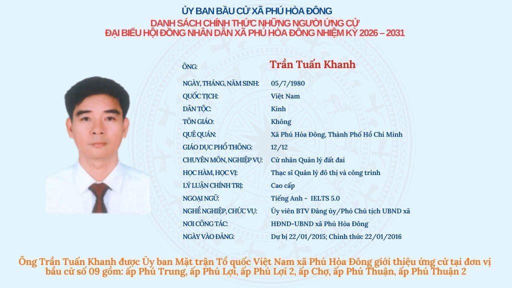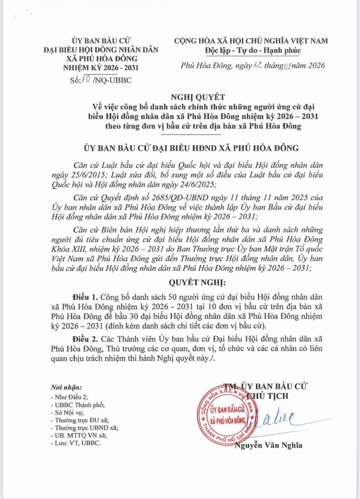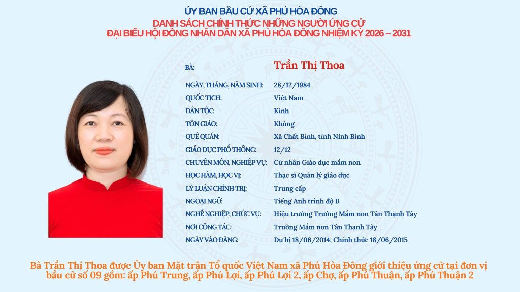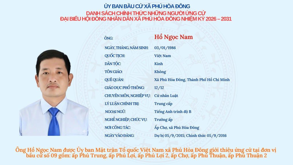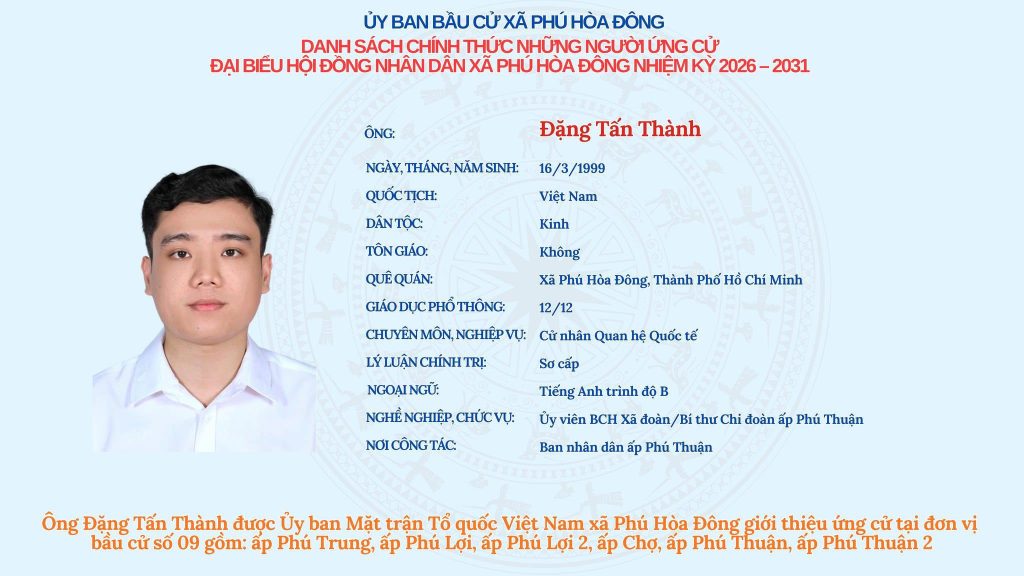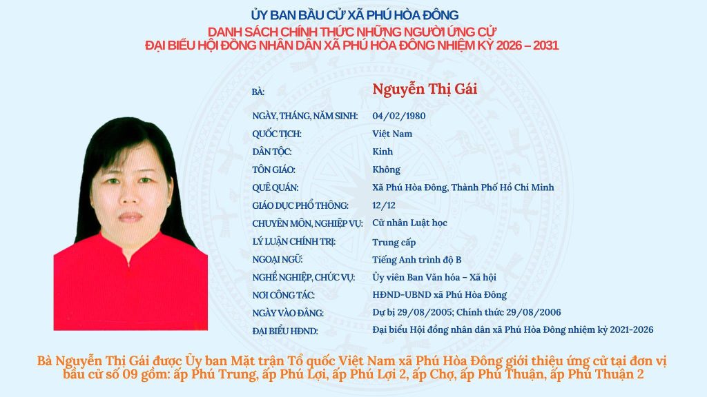 Ủy ban bầu cử xã Phú Hòa Đông trân trọng thông báo Danh sách chính thức những người ứng cử đại biểu Hội đồng nhân dân xã Phú Hòa Đông, nhiệm kỳ 2026 – 2031 tại Đơn vị bầu cử số 09.