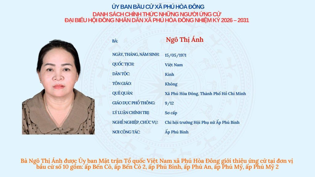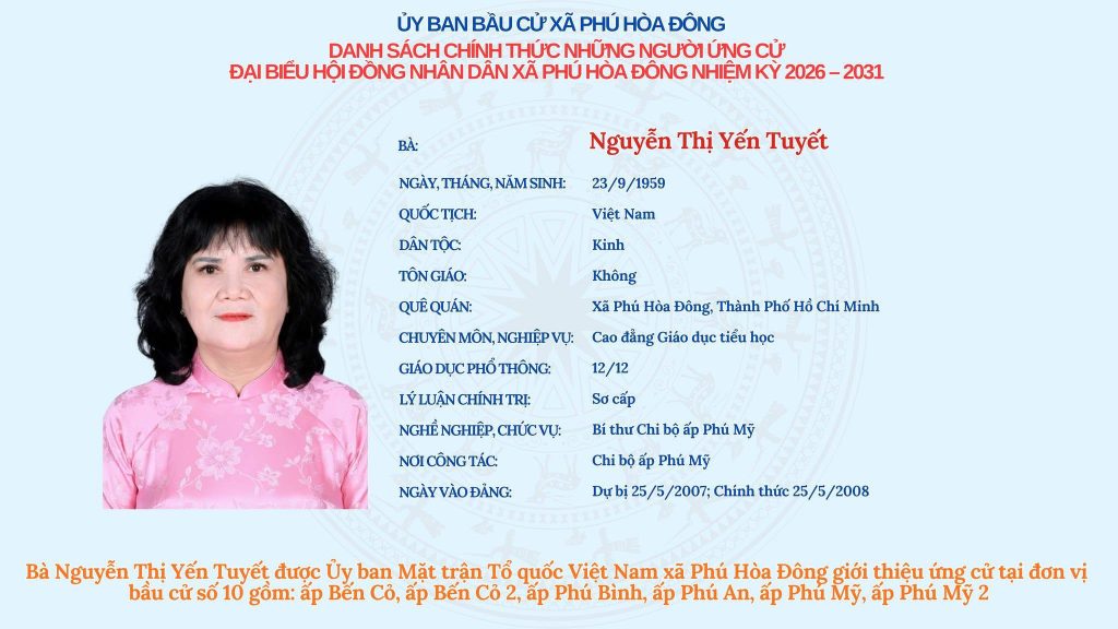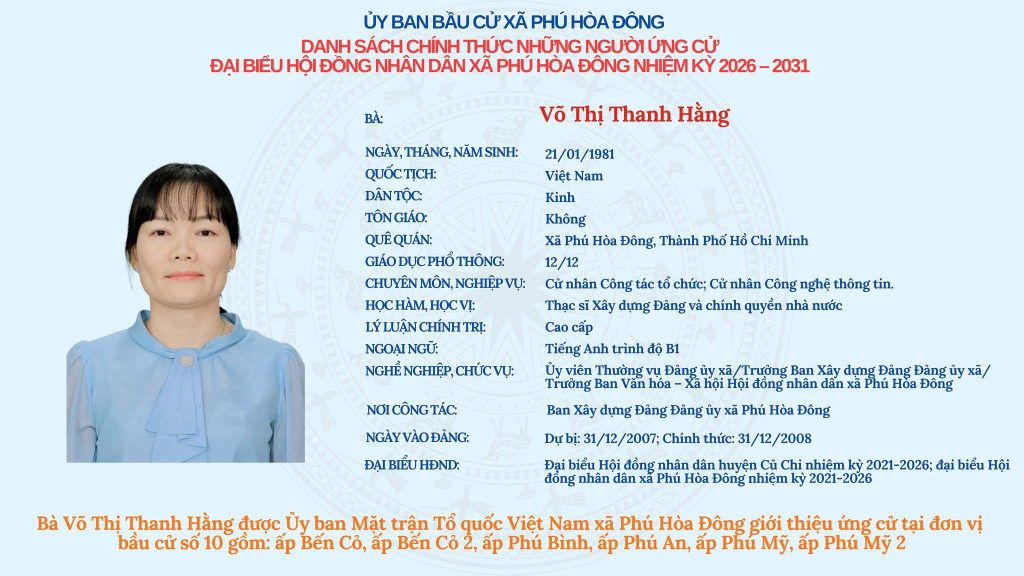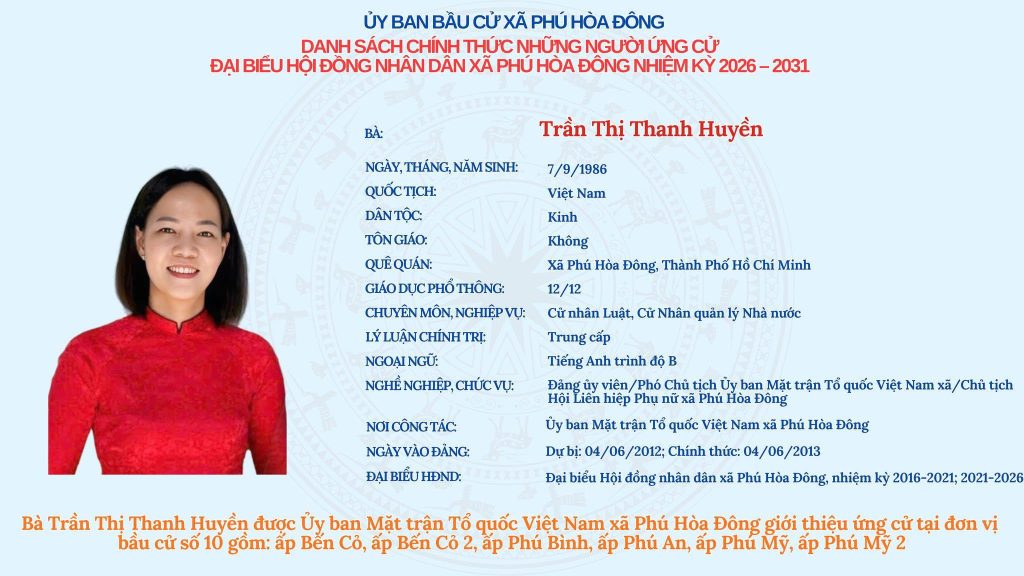 Ủy ban bầu cử xã Phú Hòa Đông trân trọng thông báo Danh sách chính thức những người ứng cử đại biểu Hội đồng nhân dân xã Phú Hòa Đông, nhiệm kỳ 2026 – 2031 tại Đơn vị bầu cử số 10.