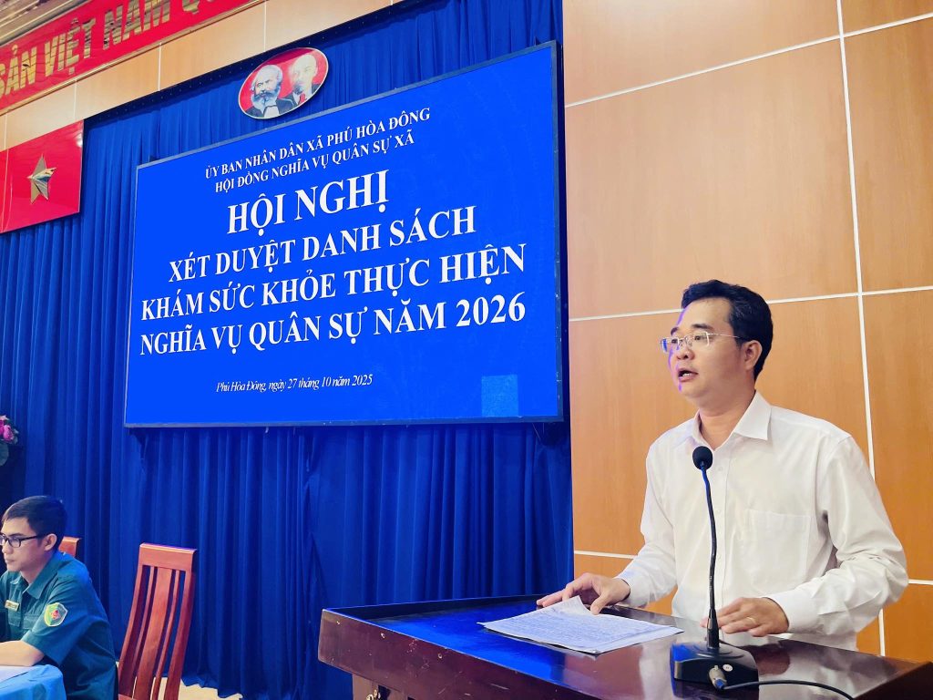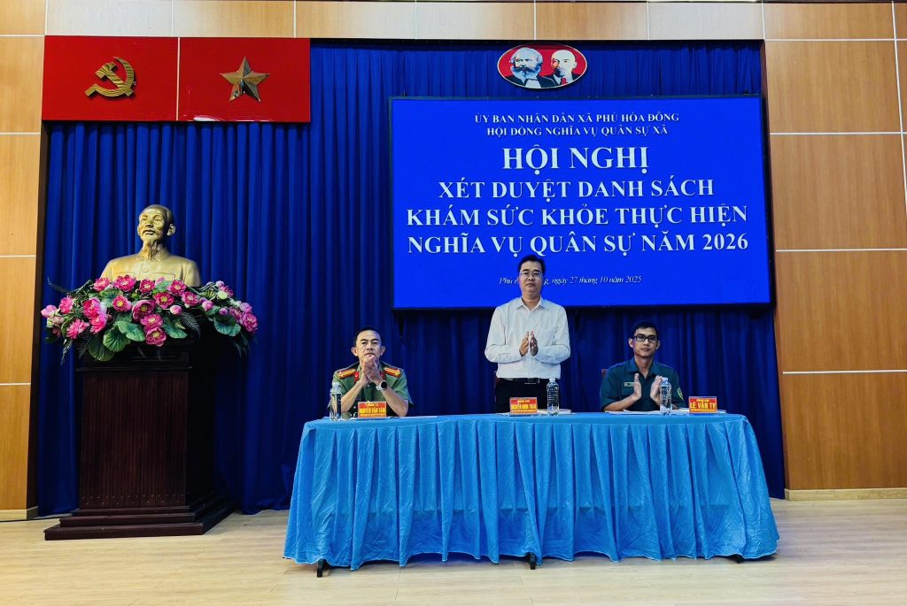 Thực hiện quy trình tuyển chọn và gọi công dân nhập ngũ năm 2026. Sáng ngày 27 tháng 10 năm 2025, Hội đồng Nghĩa vụ quân sự xã Phú Hoà Đông, TP. Hồ Chí Minh tổ chức Hội nghị xét duyệt danh sách khám sức khỏe thực hiện nghĩa vụ quân sự năm 2026.