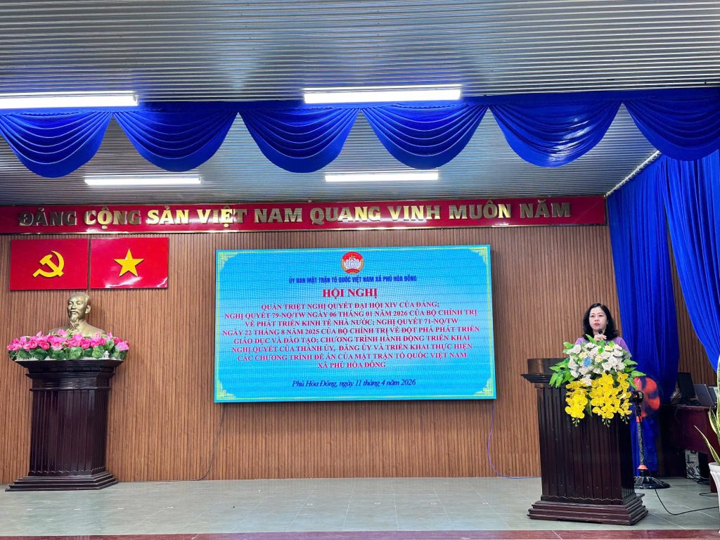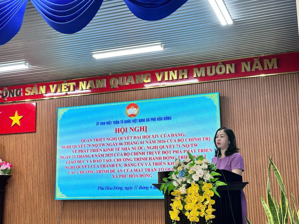 Ngày 11/4/2026, tại Hội trường Đảng ủy xã. Ban Thường trực Ủy ban Mặt trận Tổ quốc Việt Nam xã Phú Hòa Đông tổ chức Hội nghị quán triệt Nghị quyết Đại hội XIV của Đảng; Nghị quyết Đại hội trụ cột của Bộ Chính Trị; Chương trình hành động triển khai Nghị quyết của Thành ủy, Đảng ủy và triển khai thực hiện các chương trình đề án của Mặt trận Tổ quốc xã.