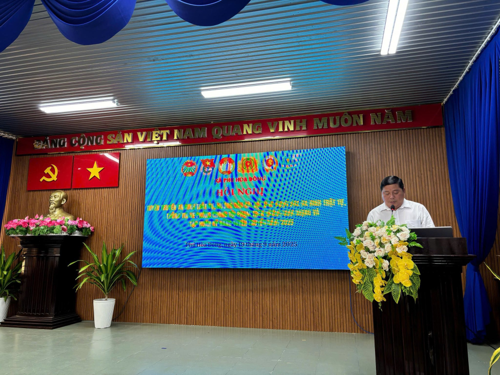 Ngày 19/9/2025, tại Hội trường Đảng ủy – Ủy ban MTTQ Việt Nam xã Phú Hòa Đông đã diễn ra Hội nghị tuyên truyền An ninh trật tự với sự tham dự của các đồng chí lãnh đạo, đại biểu đại diện Ban Xây dựng Đảng xã, Ban Thường trực Ủy ban MTTQ Việt Nam xã, Ban Chỉ huy Công an xã, Ban Chỉ huy Quân sự xã, cùng các ban ngành, đoàn thể, Bí thư chi bộ, Trưởng ấp, Ban Công tác Mặt trận và đông đảo đoàn viên, hội viên, Nhân dân tiêu biểu.