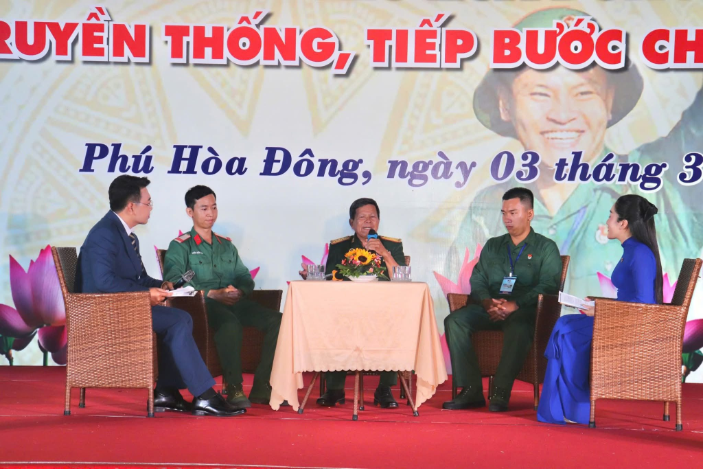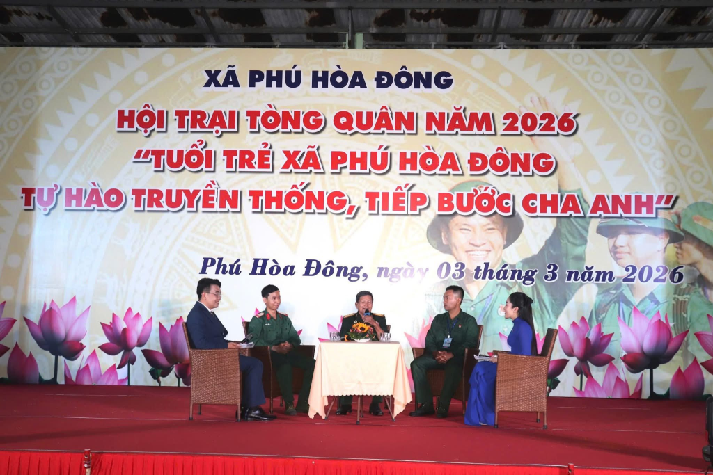 Hội trại đã cùng gặp gỡ và giao lưu với Đại tá Trương Quốc Minh, Nguyên Phó Bí thư Đảng ủy, Phó Chỉ huy trưởng, Ban Chỉ huy Quân sự huyện Củ Chi, Nguyên Bí thư Đảng ủy, Phó Giám đốc công ty Dệt may 7, Quân khu 7, hội viên Hội cựu chiến binh ấp 16, xã Phú Hòa Đông; đồng chí Thân Hữu Tài, quân nhân vừa hoàn thành xuất sắc nghĩa vụ quân sự trở về địa phương và tân binh Nguyễn Phước Thiện, đại diện cho các thanh niên lên đường nhập ngũ trong năm 2026. Những chia sẻ chân thành của các nhân vật tại phần giao lưu cũng là những lời động viên, những tình cảm chân thành nhất để các bạn trẻ làm hành trang để chuẩn bị lên đường tiếp bước cha anh bảo vệ Tổ quốc.