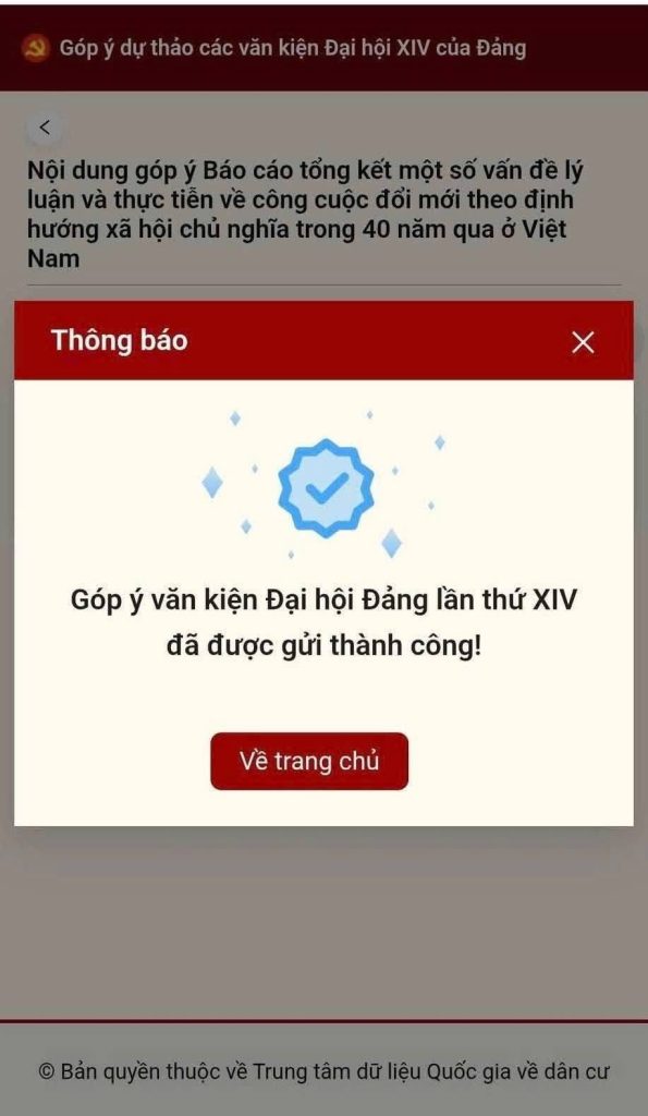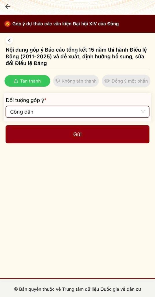 Chỉ cần mở ứng dụng VNeID, chọn mục “Góp ý dự thảo Văn kiện Đại hội XIV của Đảng”, nhập ý kiến của bạn và gửi đi (thời gian góp ý đến hết ngày 10/11/2025).
