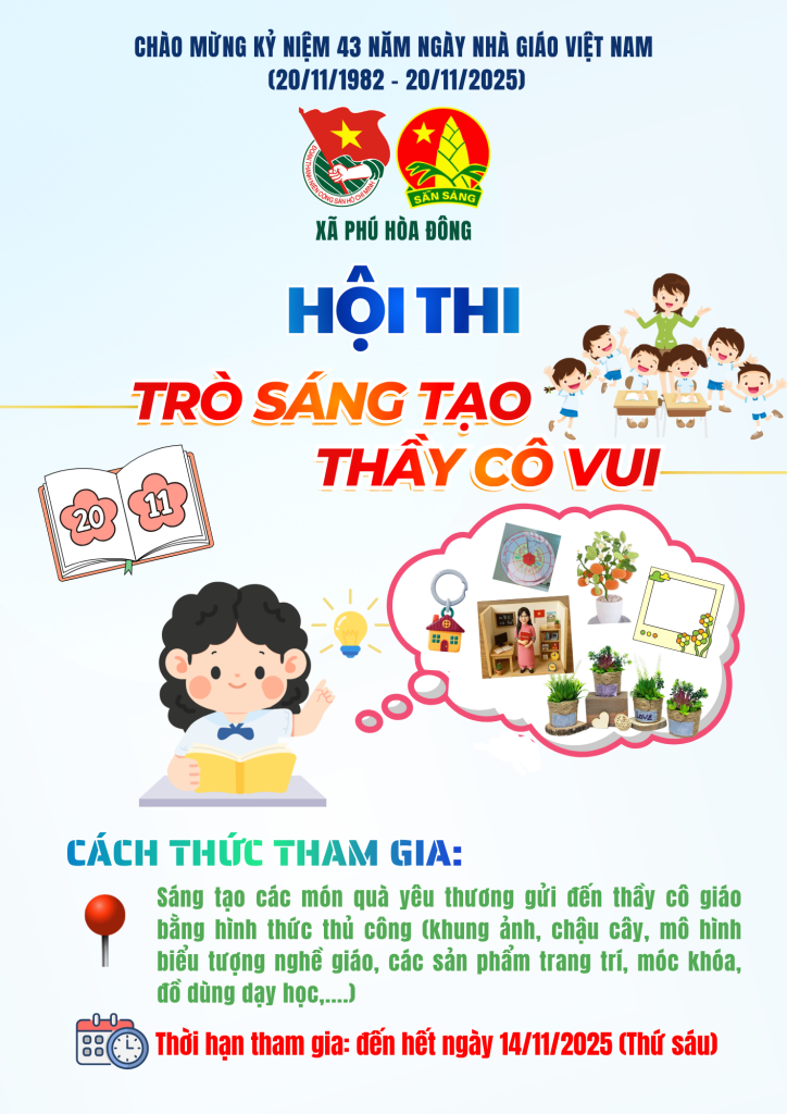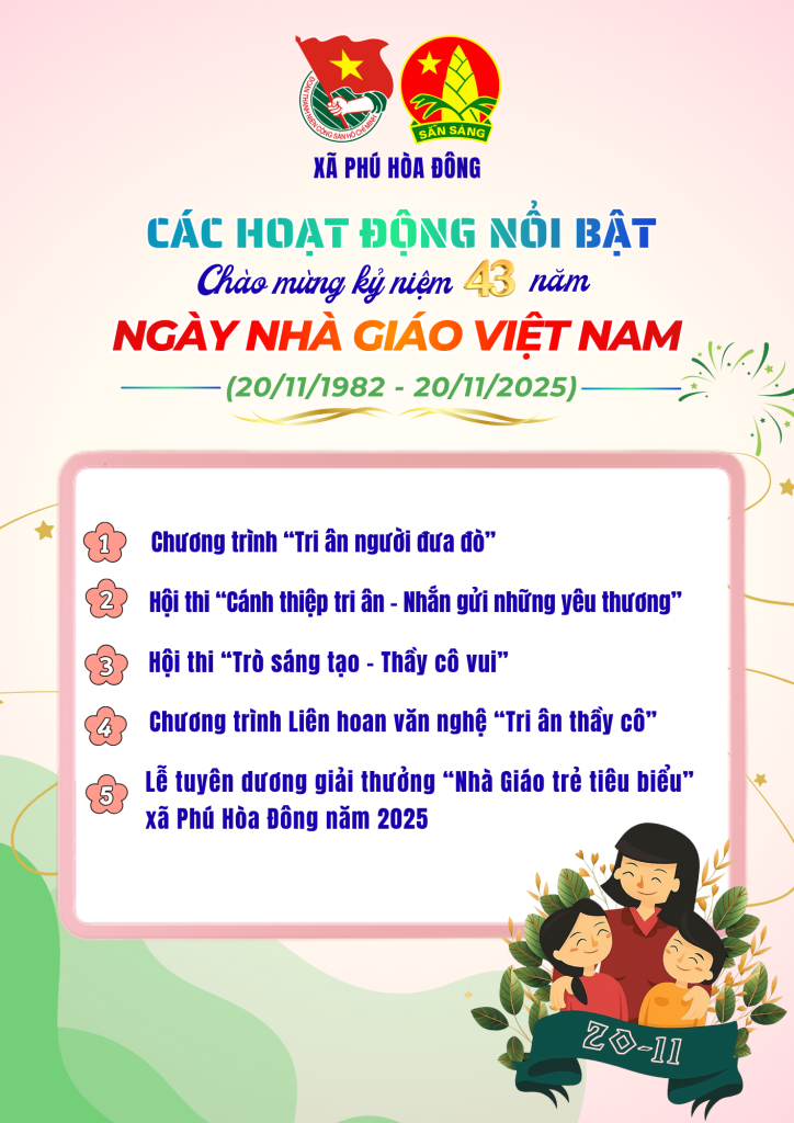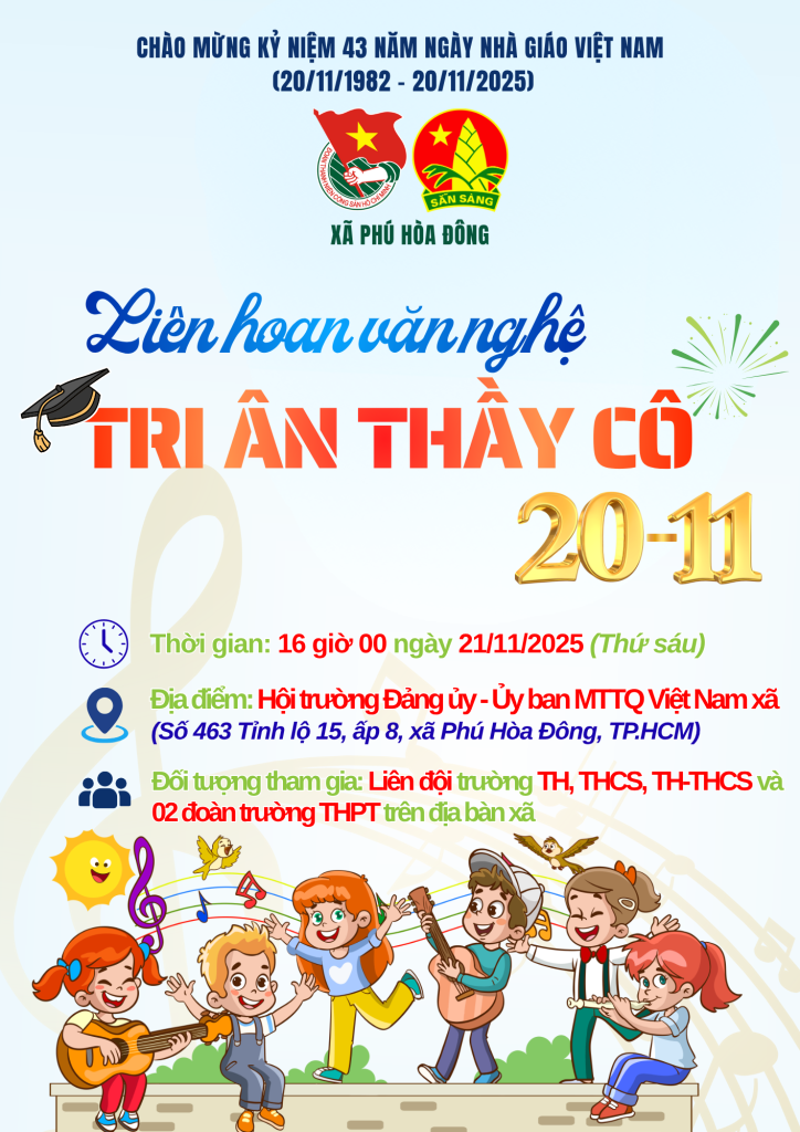 Hướng đến kỷ niệm Ngày Nhà giáo Việt Nam 20/11, Đoàn – Đội xã Phú Hòa Đông phát động đến các trường học trên địa bàn xã Phú Hòa Đông tổ chức nhiều hoạt động thiết thực, ý nghĩa nhằm tri ân công lao của đội ngũ thầy giáo, cô giáo – những người đã và đang tận tâm cống hiến cho sự nghiệp trồng người.