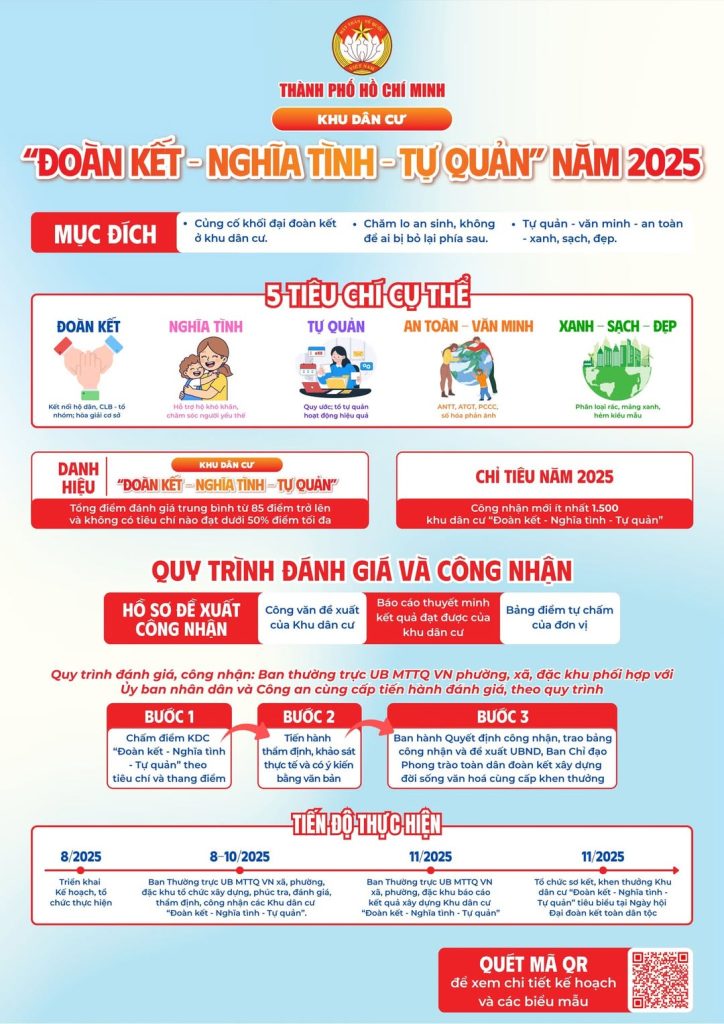 Ban Thường trực Ủy ban Mặt trận Tổ quốc Việt Nam Thành phố ban hành Kế hoạch phối hợp triển khai thực hiện xây dựng khu dân cư “Đoàn kết – Nghĩa tình – Tự quản” năm 2025, cụ thể hoá trong infographic bên dưới.