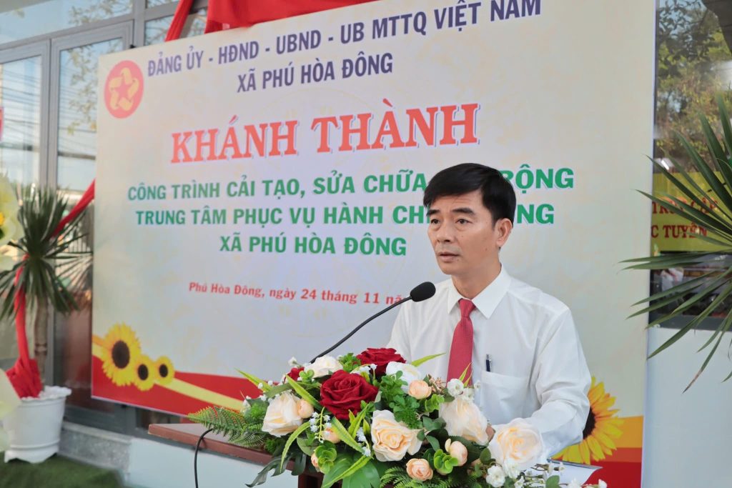 Phát biểu tại lễ khánh thành, đồng chí Nguyễn Văn Nghĩa – Bí thư Đảng ủy, Chủ tịch Hội đồng nhân dân xã chia sẻ: “Công trình khánh thành chính thức đưa vào sử dụng, tạo không gian làm việc hiện đại, thuận tiện phục vụ người dân; là dấu ấn quan trọng trong chuẩn bị cho bầu cử HĐND xã nhiệm kỳ 2026–2031, là cầu nối niềm tin giữa chính quyền và nhân dân, góp phần xây dựng Phú Hòa Đông Văn minh – Hiện đại – Nghĩa tình. Đồng chí Bí thư Đảng ủy xã đề nghị đội ngũ cán bộ, công chức tại Trung tâm: Luôn đặt người dân ở vị trí trung tâm, phục vụ với thái độ tận tâm, tôn trọng và trách nhiệm. Không ngừng nâng cao chuyên môn, đặc biệt kỹ năng công nghệ thông tin và giao tiếp. Thực hiện nghiêm kỷ luật hành chính, đảm bảo công khai, minh bạch; kiên quyết loại bỏ quan liêu, gây phiền hà. Chủ động cải tiến, đề xuất giải pháp đơn giản hóa thủ tục, hướng đến nền hành chính điện tử hiện đại.