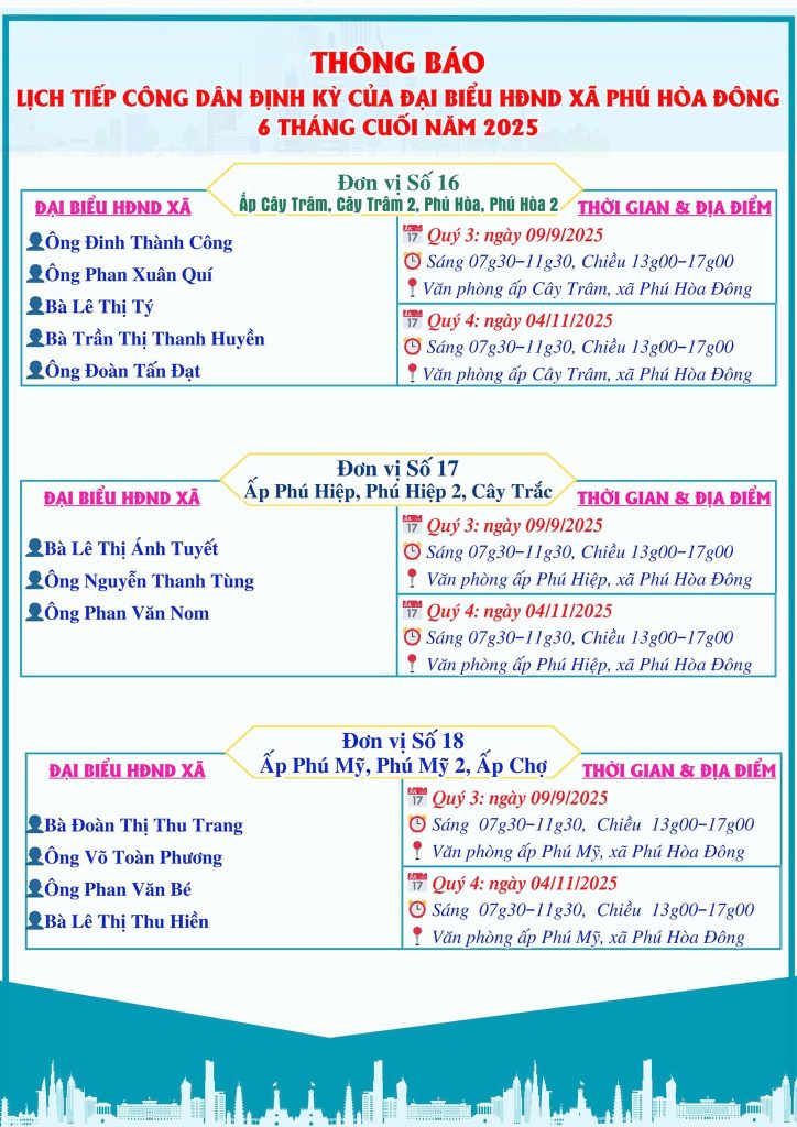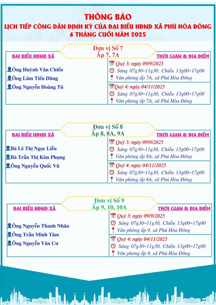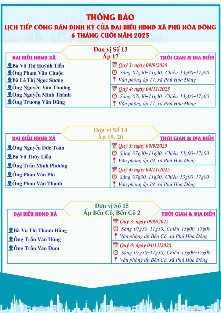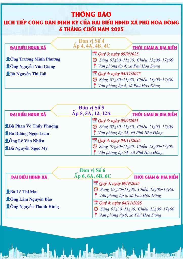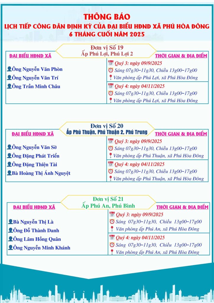 Trang chủ » Tuyên truyền vận động nhân dân » LỊCH TIẾP CÔNG DÂN CỦA ĐẠI BIỂU HỘI ĐỒNG NHÂN DÂN XÃ PHÚ HÒA ĐÔNG 6 THÁNG CUỐI NĂM 2025