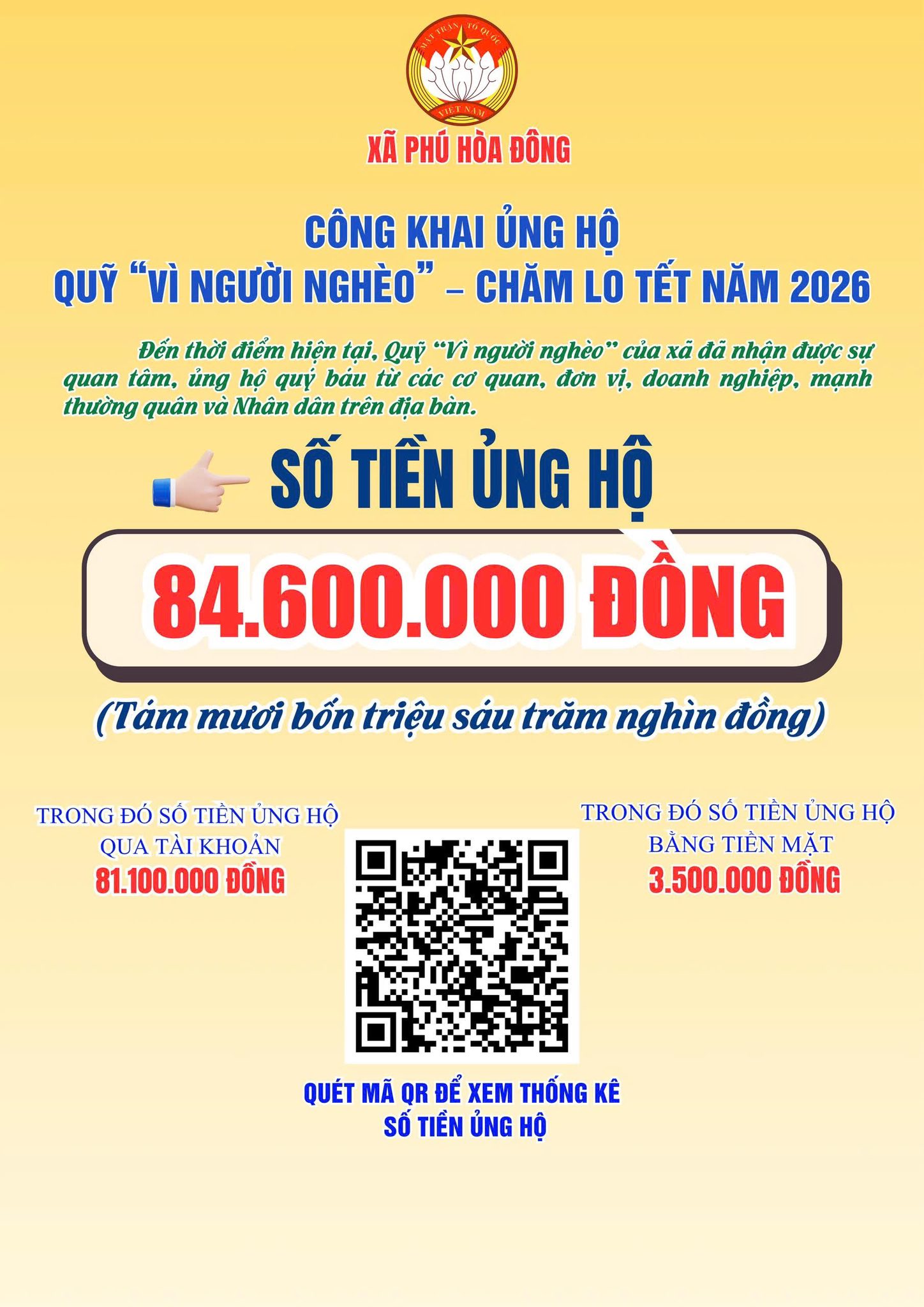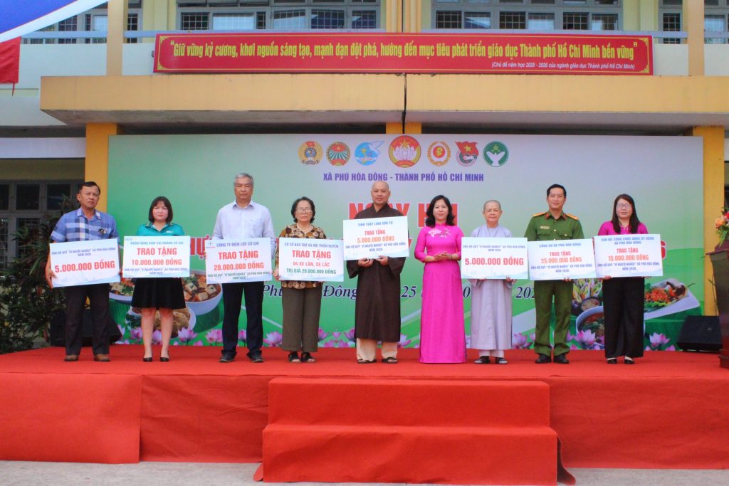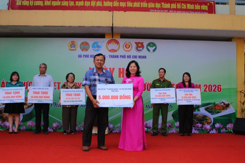 Tại chương trình, Ban Tổ chức đã báo cáo kết quả công tác phối hợp tổ chức ngày hội; đồng thời công bố các nguồn vận động ủng hộ Quỹ “Vì người nghèo” từ các đơn vị, doanh nghiệp, cơ sở tôn giáo và mạnh thường quân bằng tiền mặt và hiện vật với tổng giá trị thiết thực. Nhiều đơn vị đã trực tiếp trao bảng tượng trưng ủng hộ quỹ và quà tặng cho Ủy ban MTTQ Việt Nam xã Phú Hòa Đông.