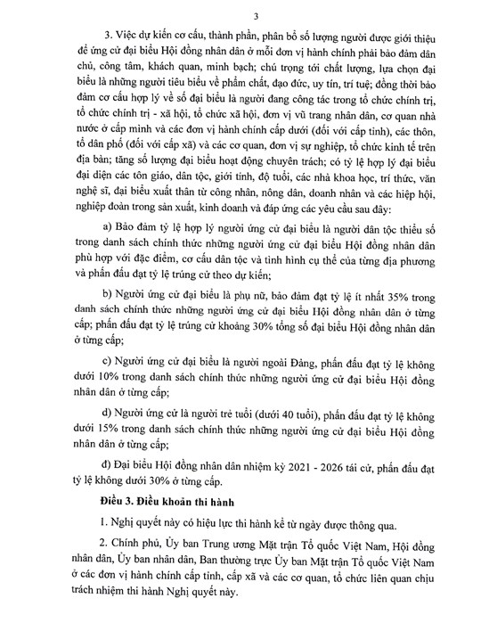 Người ứng cử là người trẻ tuổi (dưới 40 tuổi), phấn đấu đạt tỷ lệ không dưới 15% trong danh sách chính thức những người ứng cử đại biểu Hội đồng Nhân dân ở từng cấp.