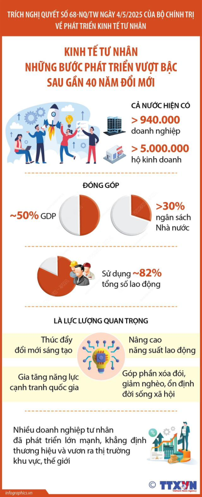 Khu vực kinh tế tư nhân hiện có khoảng hơn 940 nghìn doanh nghiệp và hơn 5 triệu hộ kinh doanh đang hoạt động, đóng góp khoảng 50% GDP, hơn 30% tổng thu ngân sách nhà nước và sử dụng khoảng 82% tổng số lao động vào tăng trưởng kinh tế, tạo việc làm, là lực lượng quan trọng thúc đẩy đổi mới sáng tạo, nâng cao năng suất lạo động, gia tăng năng lực cạnh tranh quốc gia, góp phần xóa đói, giảm nghèo, ổn định đời sống xã hội. Nhiều doanh nghiệp tư nhân đã phát triển lớn mạnh, khẳng định thương hiệu và vươn ra thị trường khu vực, thế giới.