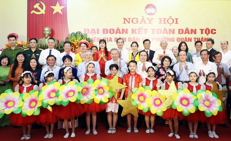 Tổng Bí thư Tô Lâm, Chủ tịch Quốc hội Trần Thanh Mẫn và các đại biểu dự Ngày hội Đại đoàn kết toàn dân tộc tại phường Quán Thánh, quận Ba Đình, TP Hà Nội tối 12/11/2024. Ảnh: Thống Nhất/TTXVN