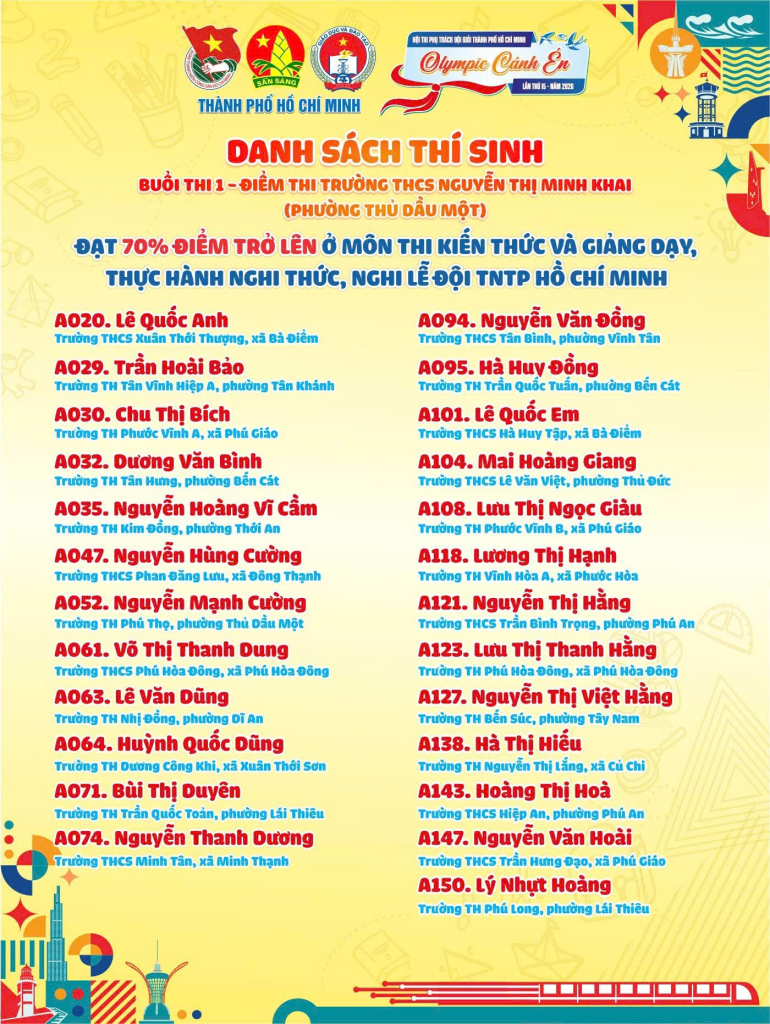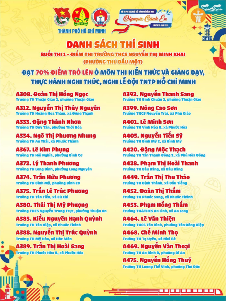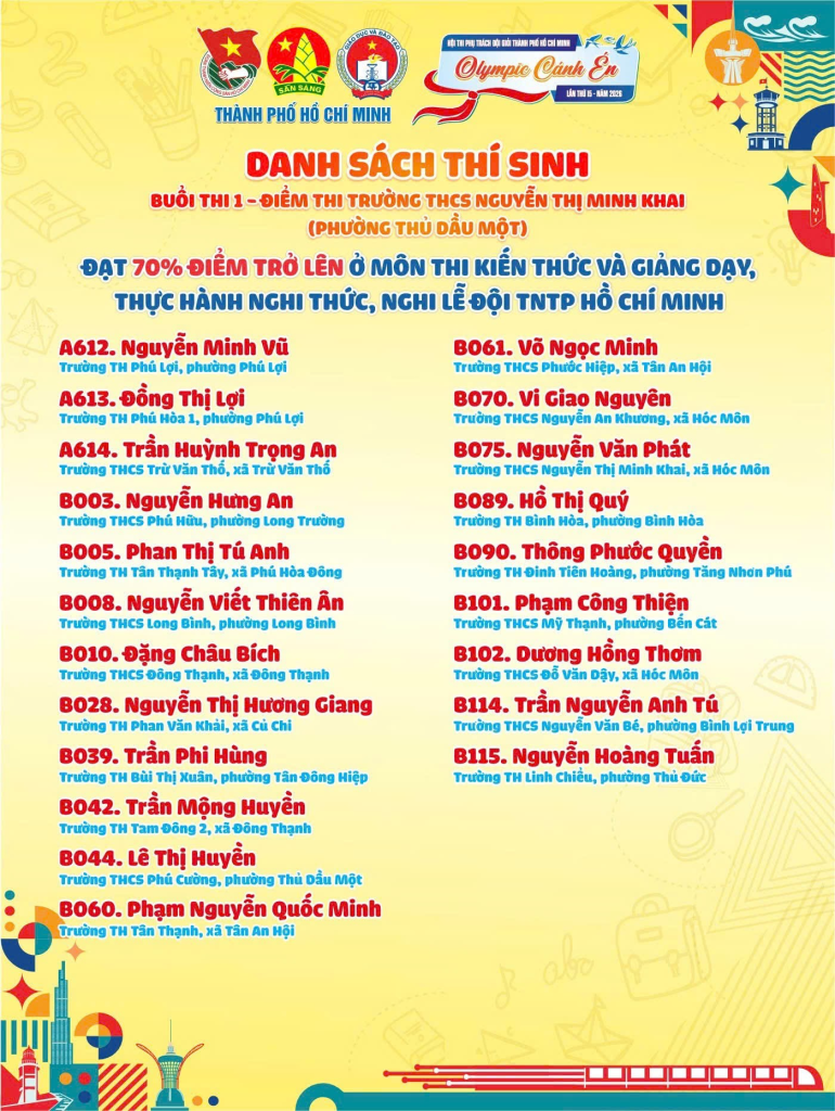 Chúc mừng 04 thí sinh xã Phú Hoà Đông đã xuất sắc vượt qua và đạt 70% điểm trở lên ở 2 môn thi đầu tiên của Hội thi Phụ trách Đội giỏi Thành phố Hồ Chí Minh – Olympic Cánh én lần thứ 15, năm 2026