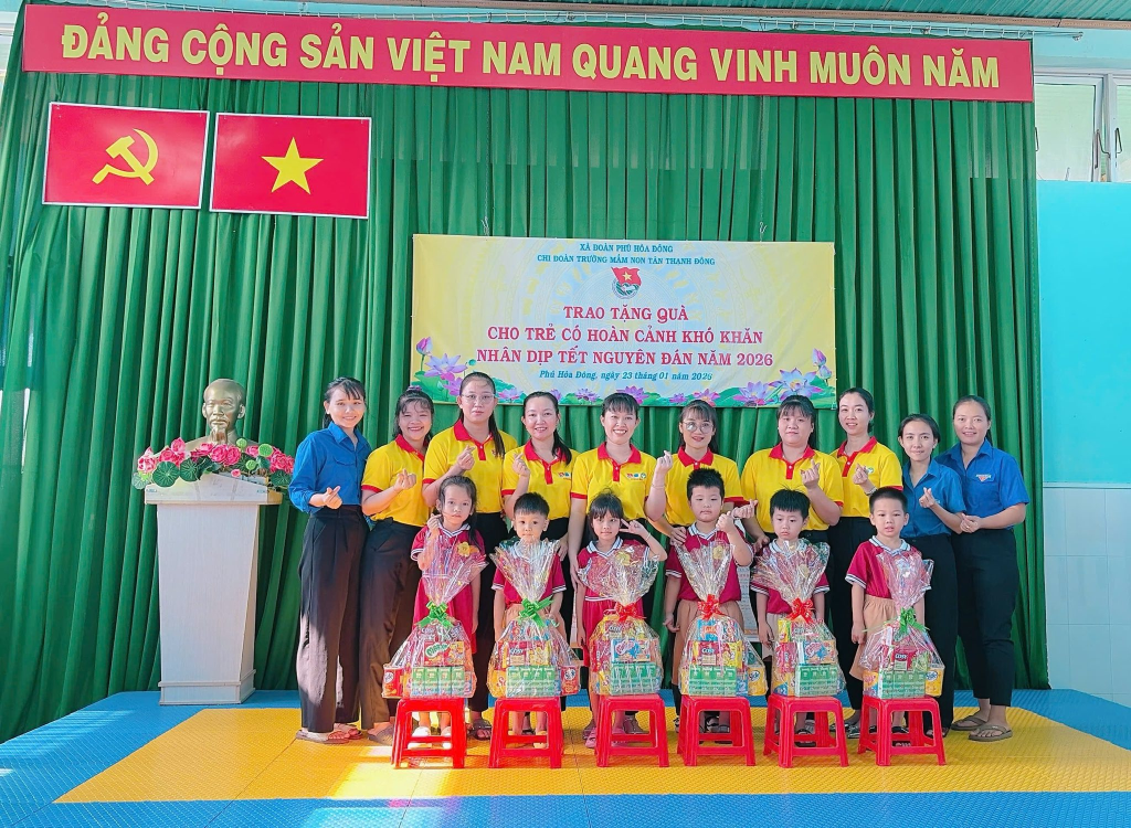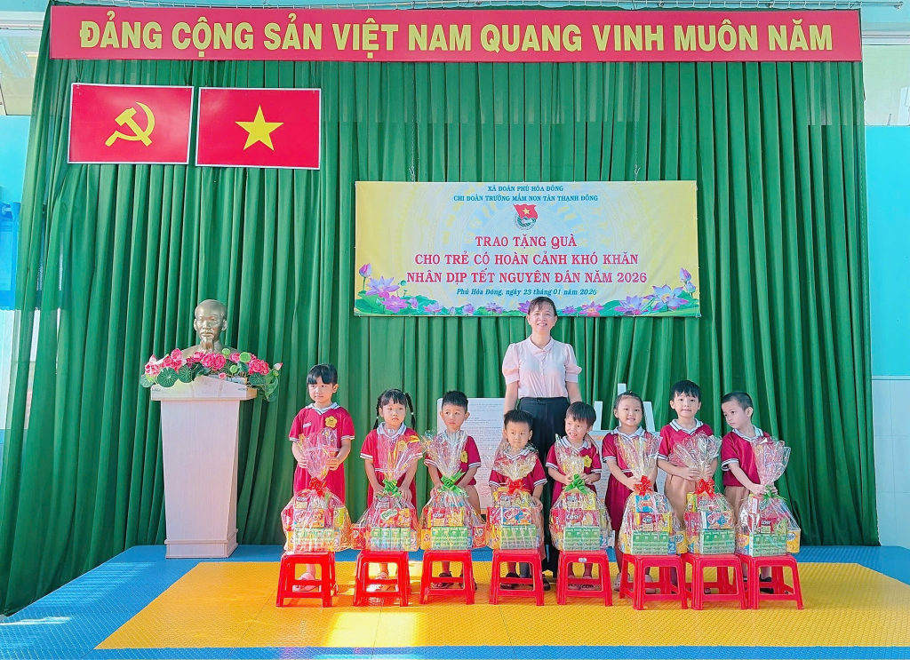 Chi đoàn giáo viên Trường Mầm non Tân Thạnh Đông tổ chức bán bao lì xì gây quỹ, nhằm hỗ trợ, chăm lo cho trẻ em có hoàn cảnh khó khăn đang học tập tại đơn vị. Chi đoàn đã trao tặng 16 phần quà cho các em thiếu nhi với tổng kinh phí 3.000.000 đồng và trao tặng quà cho 02 gia đình chính sách có hoàn cảnh khó khăn tại ấp 6B, xã Phú Hòa Đông.