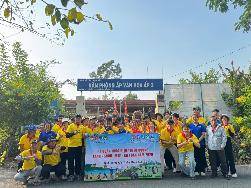 Xã Đoàn Phú Hòa Đông phối hợp cùng Chiến sĩ Xuân tình nguyện Trường Đại học Bách Khoa – ĐHQG-HCM, Khoa Điện – Điện tử tổ chức ra quân thực hiện tuyến đường “Xanh – Sạch – Đẹp – An toàn” năm 2026 trên tuyến đường Bến Lội, ấp 20, xã Phú Hòa Đông.