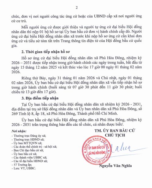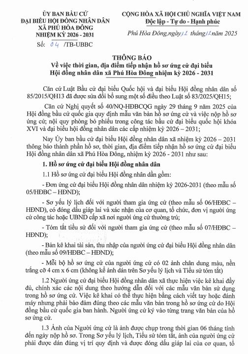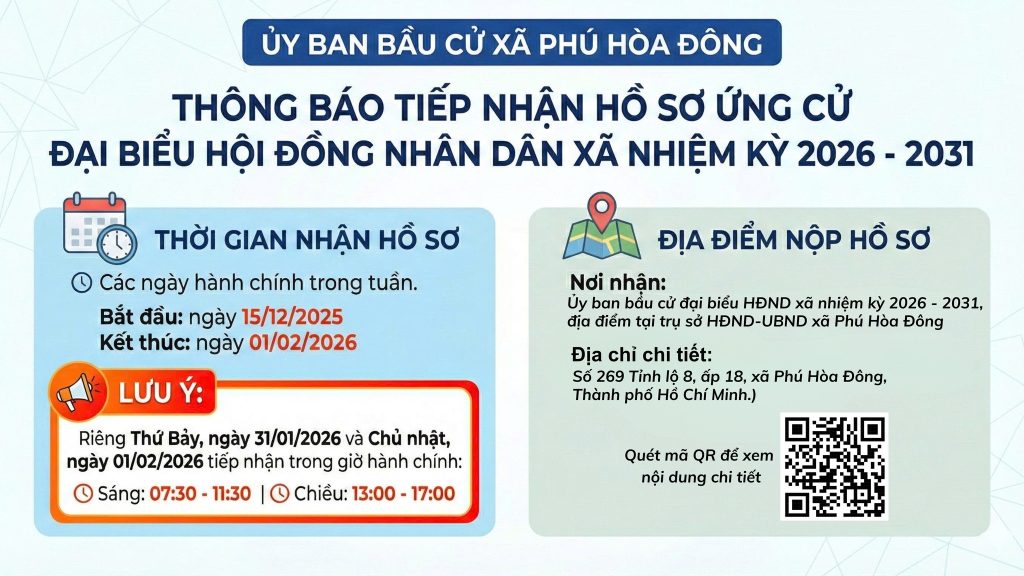Thông báo tiếp nhận hồ sơ ứng cử đại biểu Hội đồng nhân dân xã Phú Hòa Đông, nhiệm kỳ 2026 – 2031