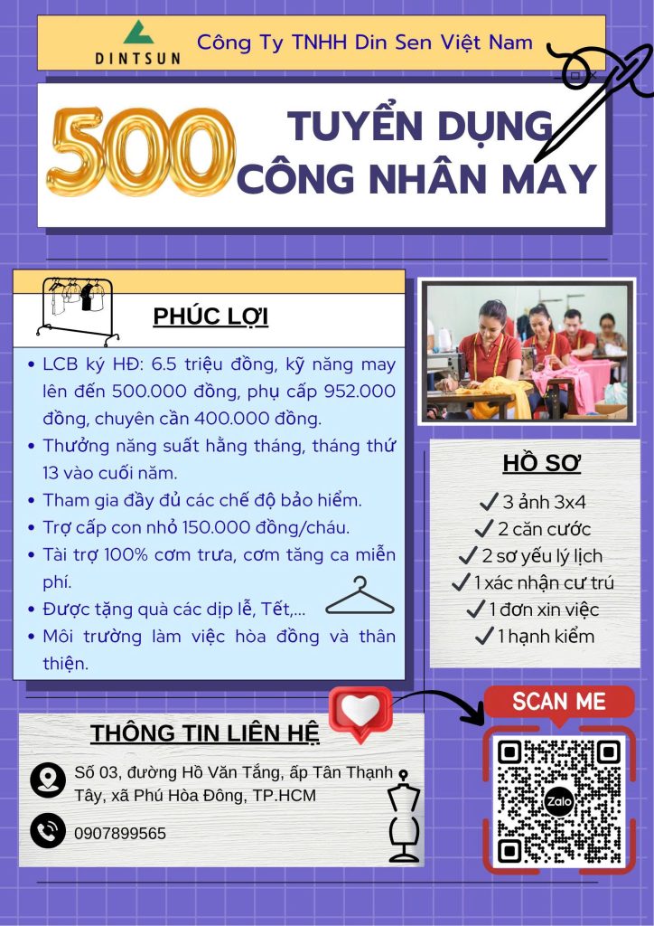 Công đoàn xã Phú Hòa Đông thông tin: Công ty TNHH Din Sen Việt Nam tuyển 500 công nhân may.