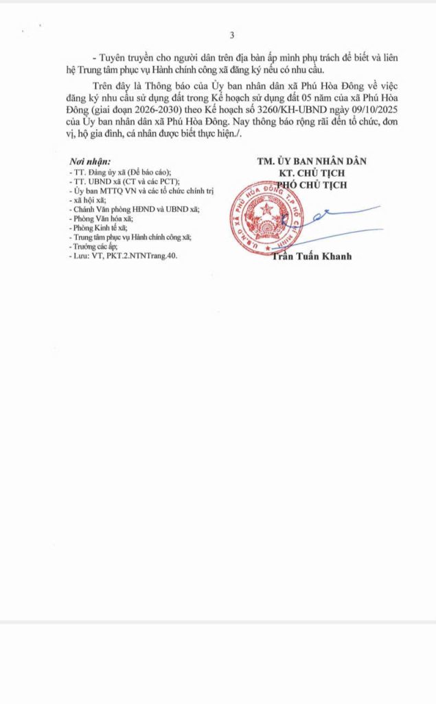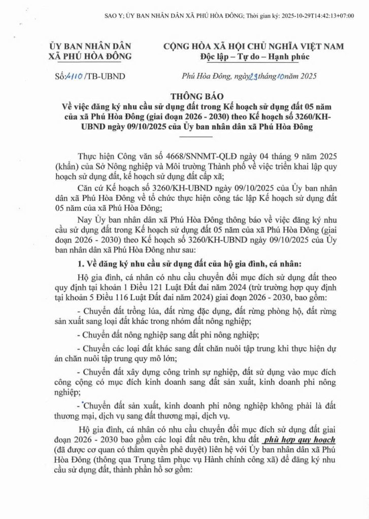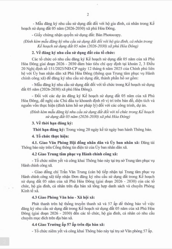 Hộ gia đình, cá nhân, tổ chức có nhu cầu chuyển đổi mục đích sử dụng đất; tổ chức có nhu cầu đăng ký sử dụng đất theo Kế hoạch 3260/KH-UBND ngày 09 tháng 10 năm 2025 của Ủy ban nhân dân xã Phú Hòa Đông, gửi Hồ sơ về Trung tâm Hành chính công xã Phú Hòa Đông, trong thời hạn 20 ngày kể từ ngày ban hành Thông báo này.