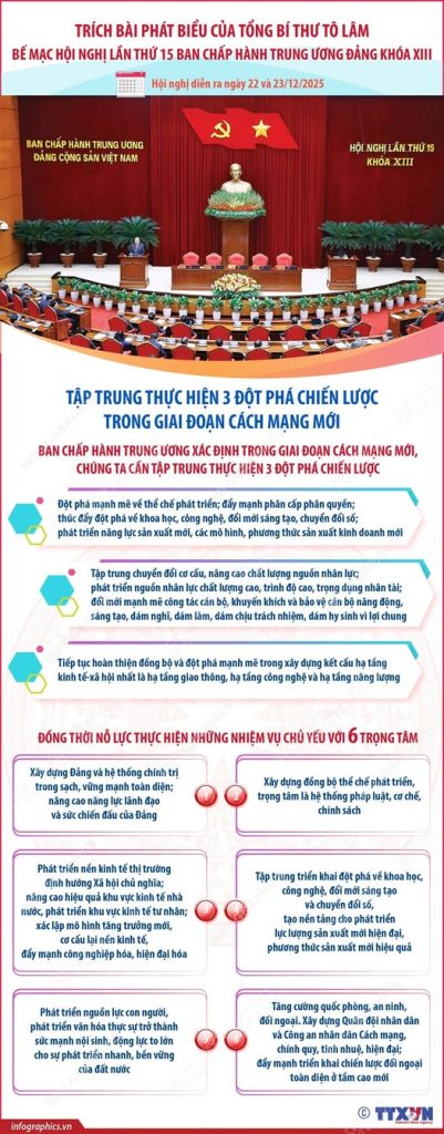 Sau 2 ngày làm việc khẩn trương, sáng 23/12/2025, Hội nghị lần thứ 15 Ban Chấp hành Trung ương Đảng khóa XIII đã hoàn thành toàn bộ nội dung, chương trình đề ra với sự đoàn kết, thống nhất cao, chất lượng tốt. Ban Chấp hành Trung ương xác định trong giai đoạn cách mạng mới, chúng ta cần tập trung thực hiện 3 đột phá chiến lược. Đồng thời nỗ lực thực hiện những nhiệm vụ chủ yếu với 6 trọng tâm.