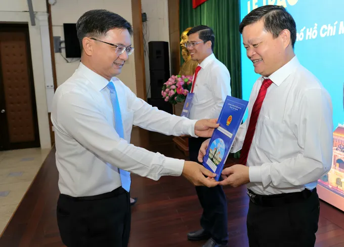 Phó Chủ tịch UBND TPHCM Nguyễn Mạnh Cường và Phó Bí thư Đảng ủy UBND TPHCM chúc mừng các đồng chí nhận nhiệm vụ