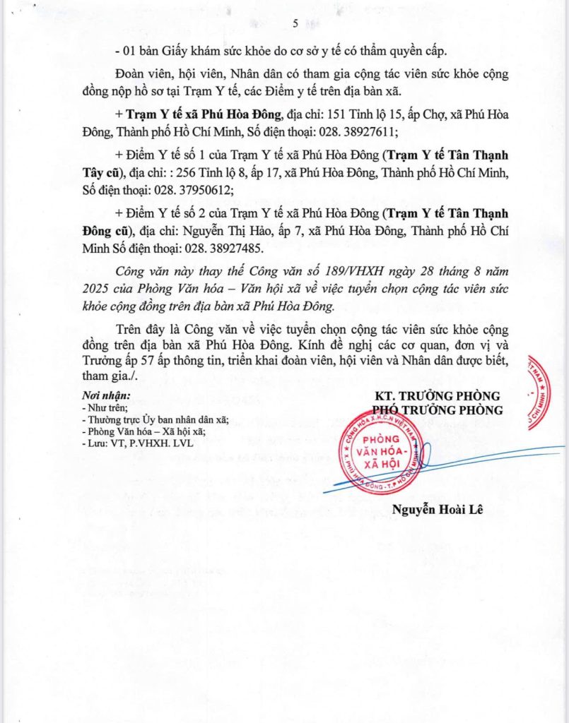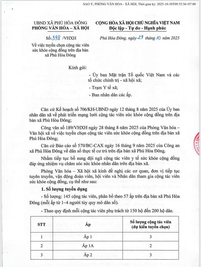 Phòng Văn hóa – Xã hội, Ủy ban nhân dân xã Phú Hòa Đông vừa ban hành Công văn số 398/VHXH ngày 29 tháng 10 năm 2025 về việc tuyển chọn cộng tác viên sức khỏe cộng đồng trên địa bàn xã.