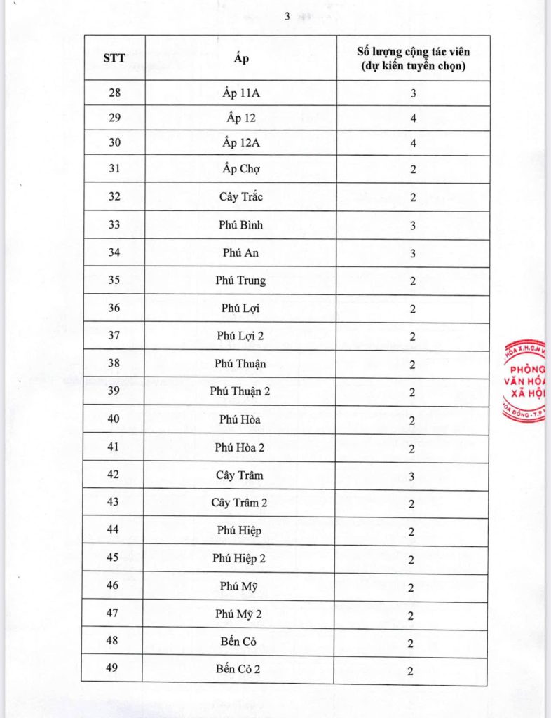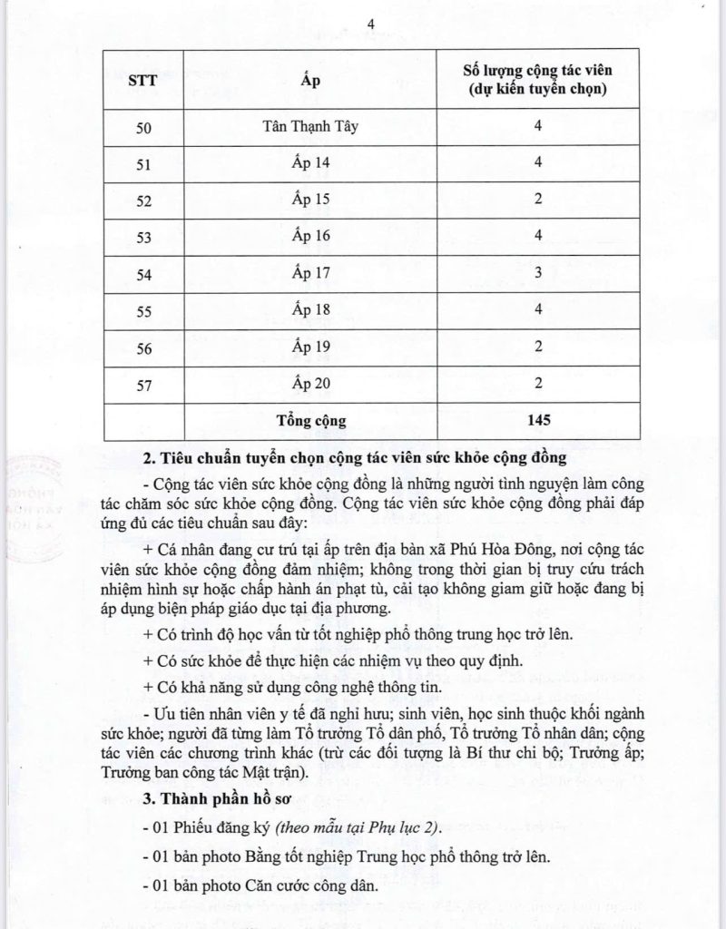 Theo kế hoạch, xã Phú Hòa Đông dự kiến tuyển chọn 145 cộng tác viên phân bổ tại 57 ấp trên toàn xã. Mỗi cộng tác viên phụ trách từ 150 đến 200 hộ dân.