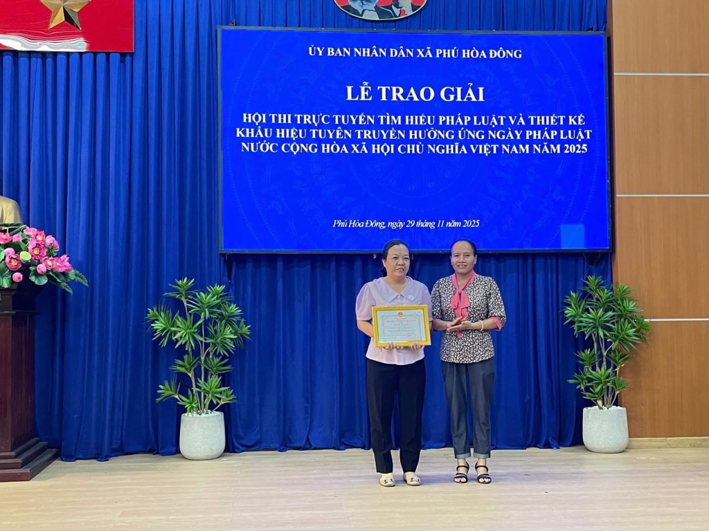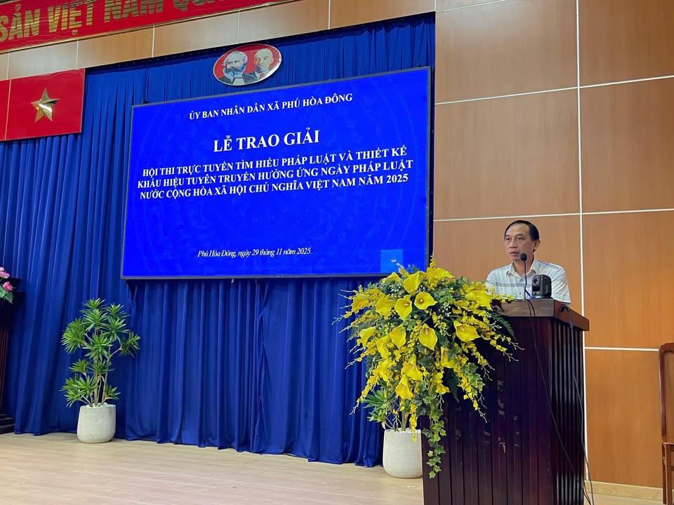 Nhằm đẩy mạnh công tác tuyên truyền, phổ biến pháp luật đến cán bộ và nhân dân trên địa bàn xã, ngày 29/11/2025, Ủy ban nhân dân xã Phú Hòa Đông tổ chức Lễ trao giải Hội thi trực tuyến tìm hiểu Pháp luật và thiết kế khẩu hiệu tuyên truyền hưởng ứng Ngày Pháp luật nước Cộng hòa xã hội Chủ nghĩa Việt Nam năm 2025.