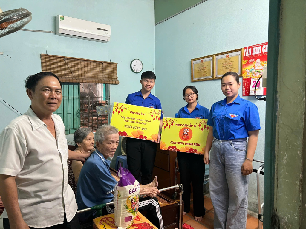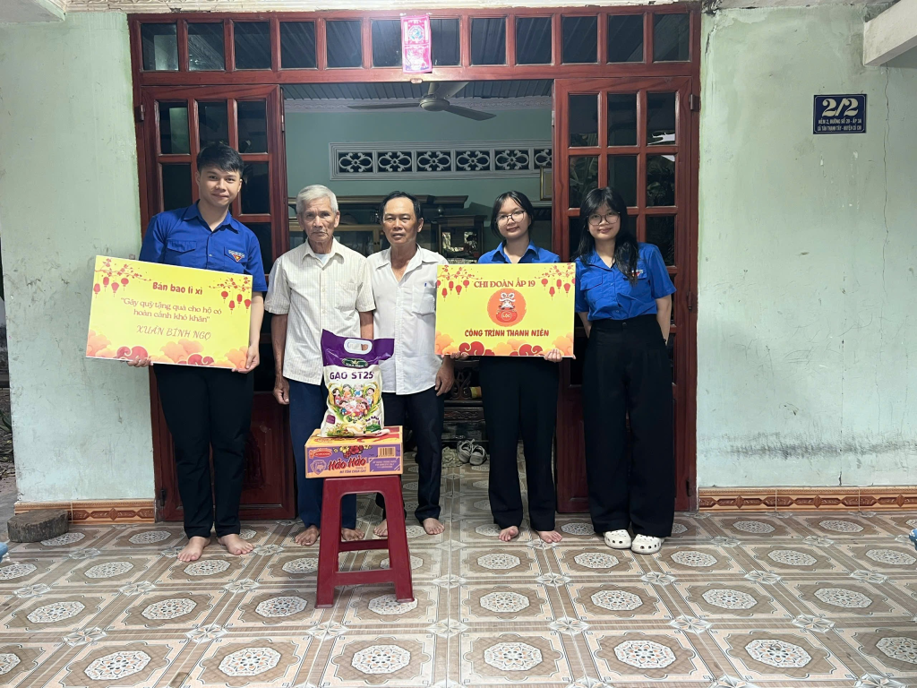 Thực hiện công trình thanh niên năm 2026 “Bán bao lì xì gây quỹ tặng quà cho hộ khó khăn” nhân dịp Xuân Bính Ngọ, Chi đoàn ấp 19 đã tổ chức đến thăm và trao tặng quà cho 01 hộ khó khăn và 01 hộ chính sách khó khăn trên địa bàn ấp. Thể hiện tinh thần xung kích, tình nguyện và sự sẻ chia của đoàn viên, thanh niên, góp phần mang đến một mùa xuân ấm áp, nghĩa tình cho các hộ dân có hoàn cảnh khó khăn.